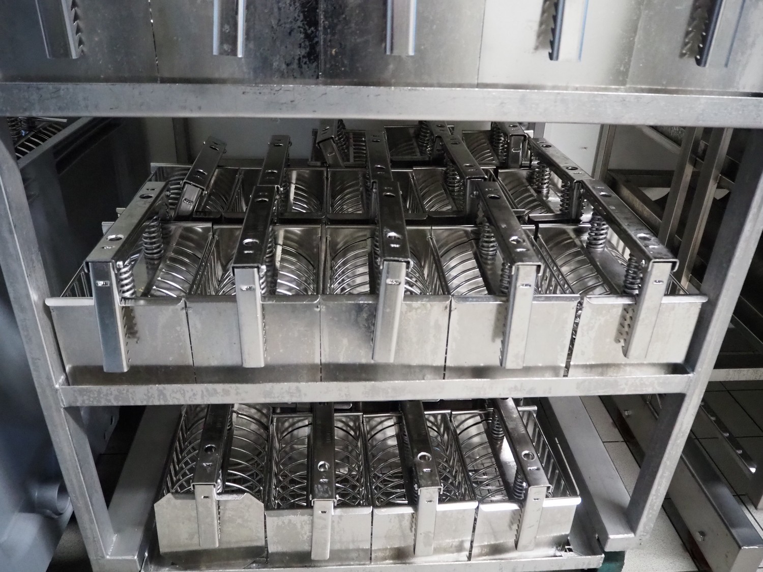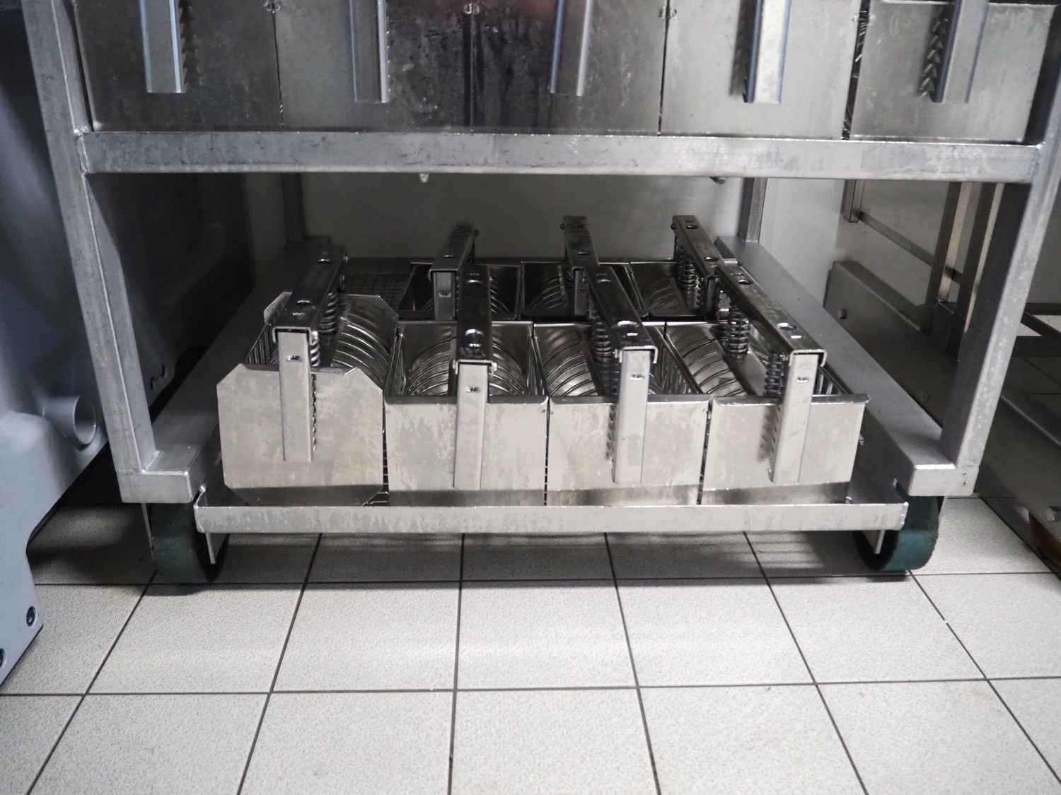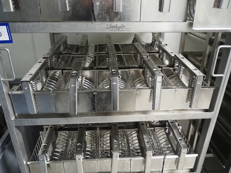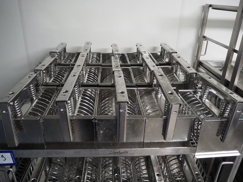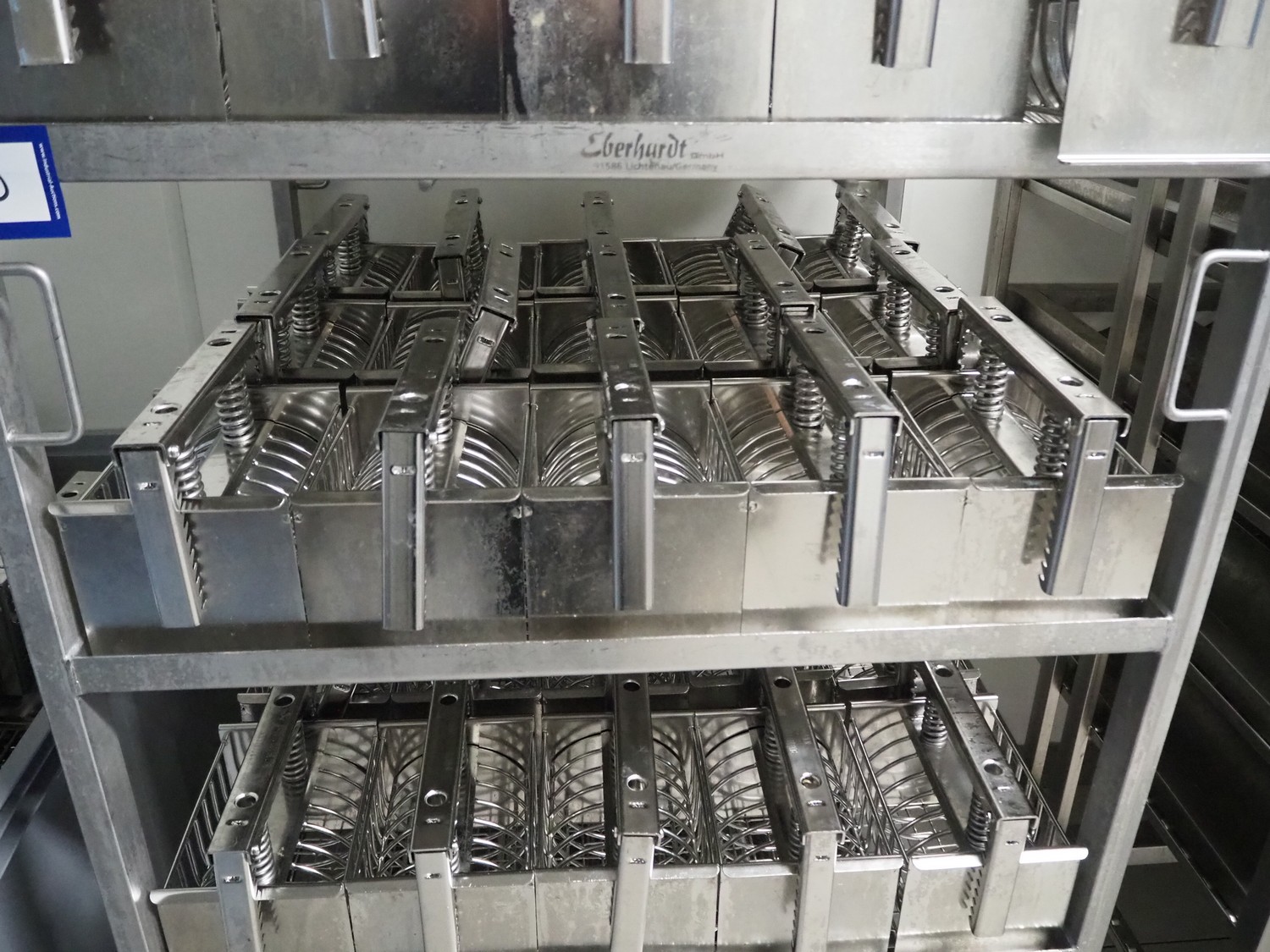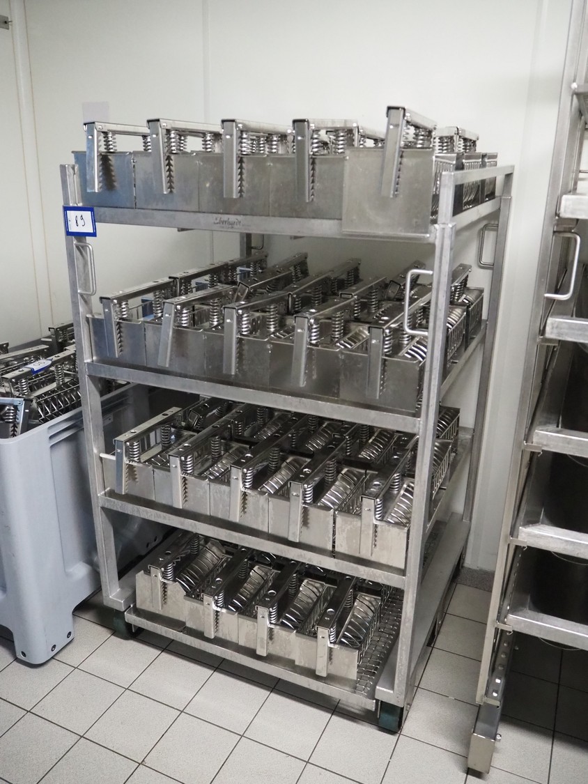 Eberhardt GmbH cooking trolley with 4 floors, dimensions trolley: 1000 mm x 1000 mm x 1500 mm, including approximately 50 Adelmann ham moulds, inside diameter moulds: 165 mm, inside length moulds: 235 mm, total dimensions moulds: 300 mm x 180 mm x 250 mm.