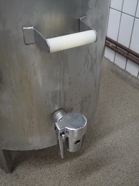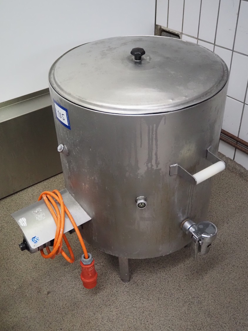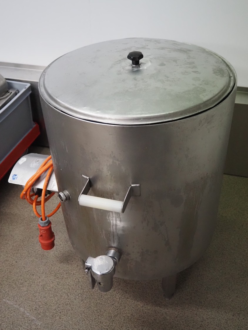 Brӧkelmann glycerine-bath cooking vessel, volume: 120 liter, inside diameter: 530 mm, inside height: 530 mm, total dimensions: 920 mm x 700 mm x 950 mm.