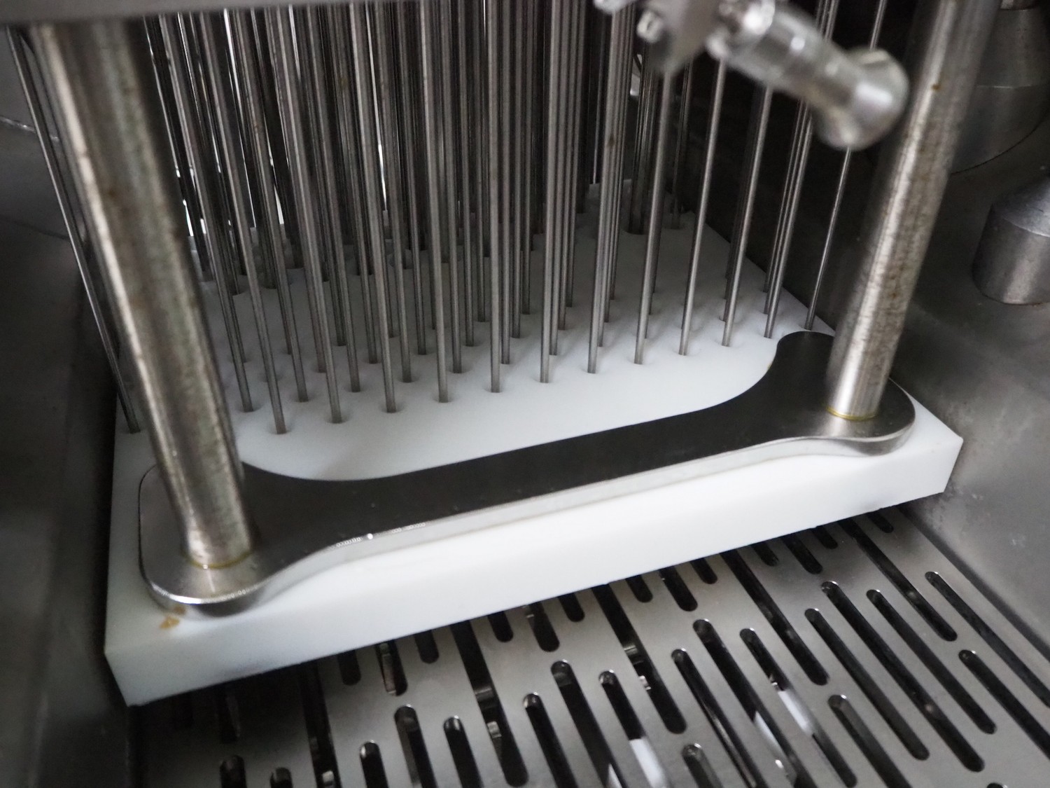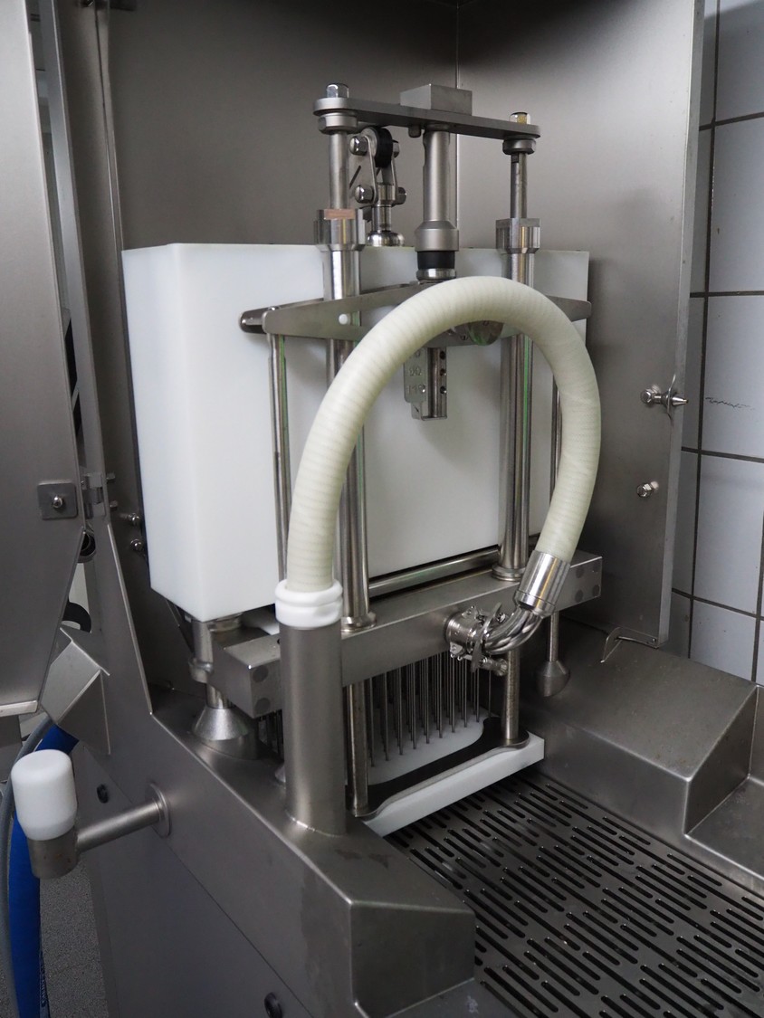 Rühle injector with tenderizer and lifter for E2 crates, model: IR 56, serial number: 30010727, year of construction: 2024, 400 V, 3 Ph, 50/60 Hz, 16 A, 8.7 kW, 56 needles, walking beam, beam width: 350 mm, total dimensions: 1900 mm x 1000 mm x 2050 mm.