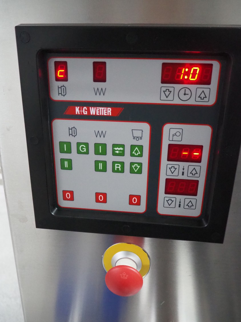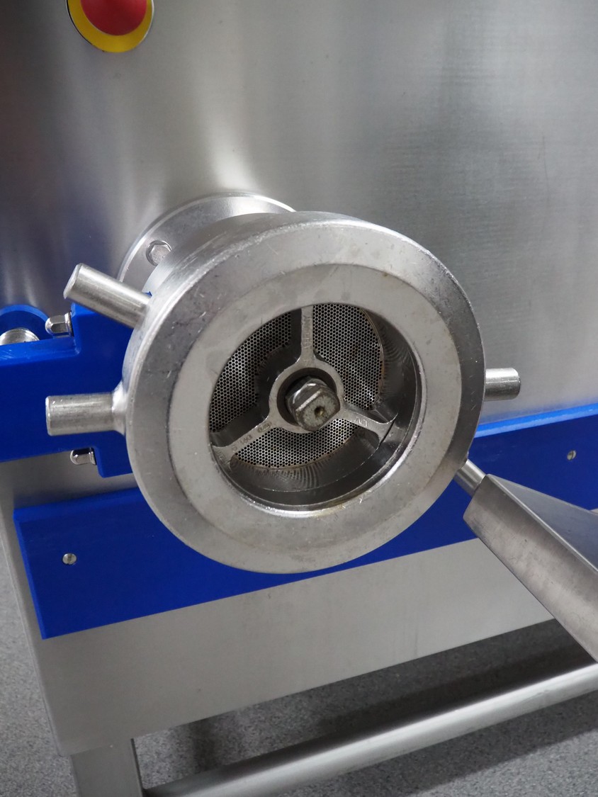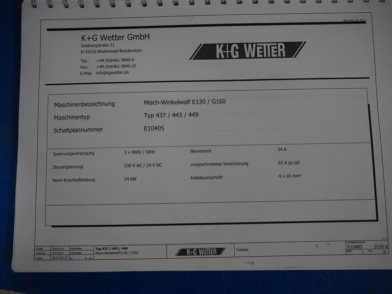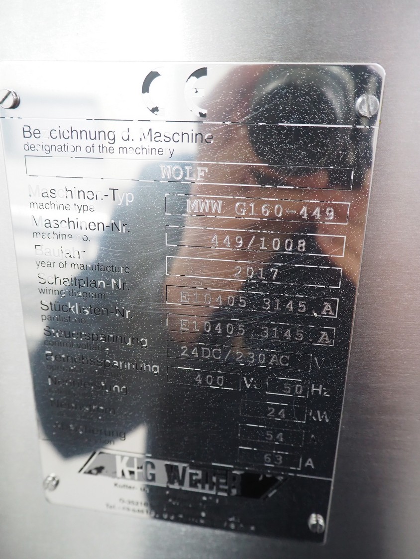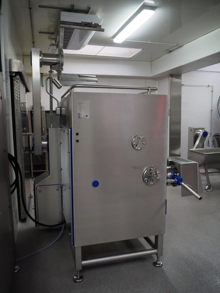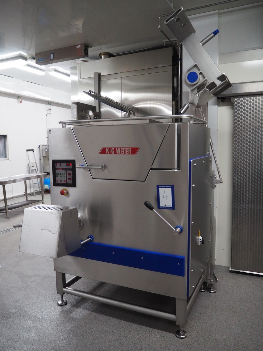 K+G Wetter mixer-grinder with lifter for 200 liter meat bins, machine type: MWW G160-449, machine number: 449/1008, year of construction: 2017, 400 V, 50 Hz, control voltage: 24 DC / 230 AC, rated current: 54 A, 24 kW, plate diameter: 160 mm, hopper capacity: 355 liter, pneumatic sorting device, emptying monitoring, bayonet lock nut, ejecting device for worm and cutting set, mixing arm and shaft for frozen meat, total dimensions: 2700 mm x 2000 mm x 1850 mm. Workshop tested in 2024. Mixer-grinder need to be removed by crane.