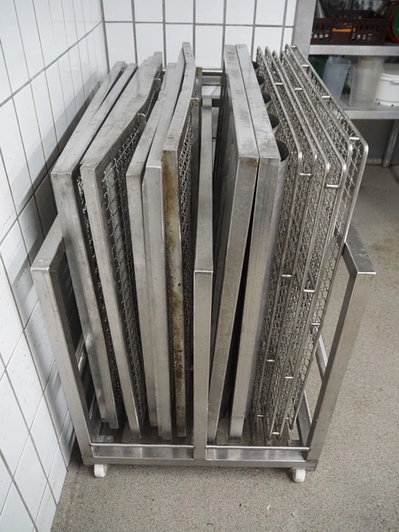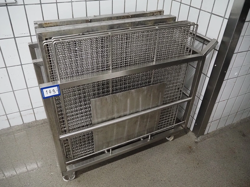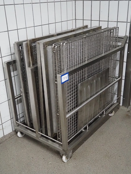 S/s trolley with approximately 12 s/s cooking plates, dimensions plates: (12x) 1000 mm x 1000 mm, dimensions trolley: 1300 mm x 760 mm x 1050 mm.