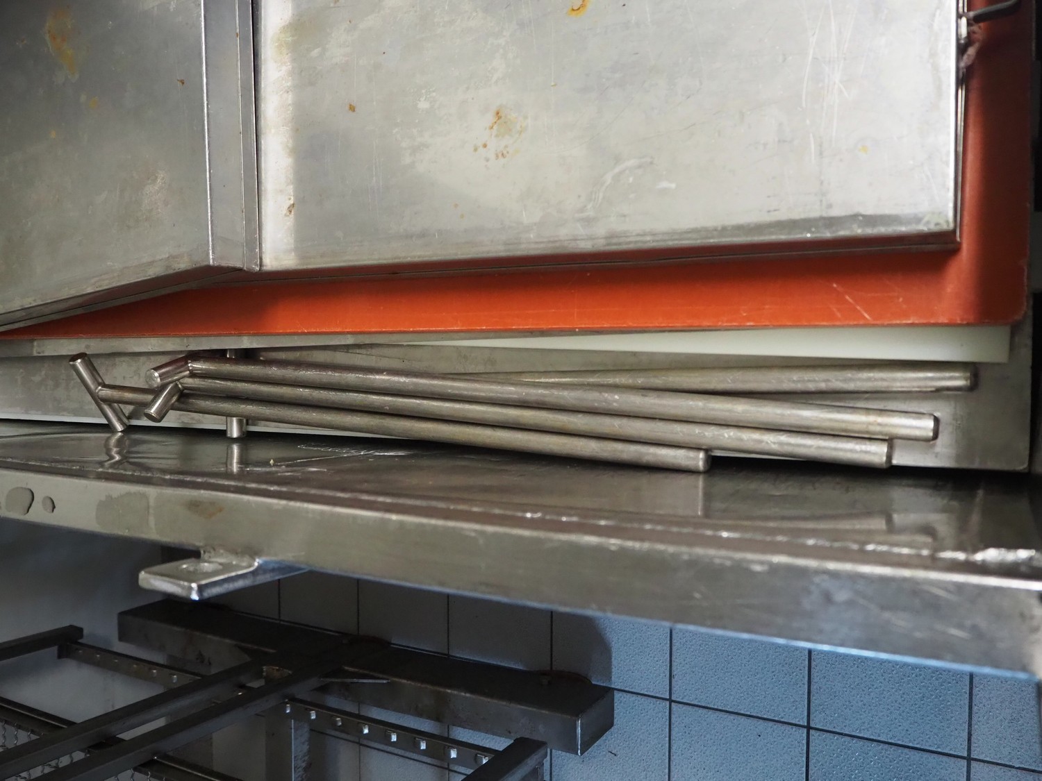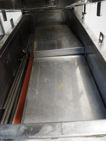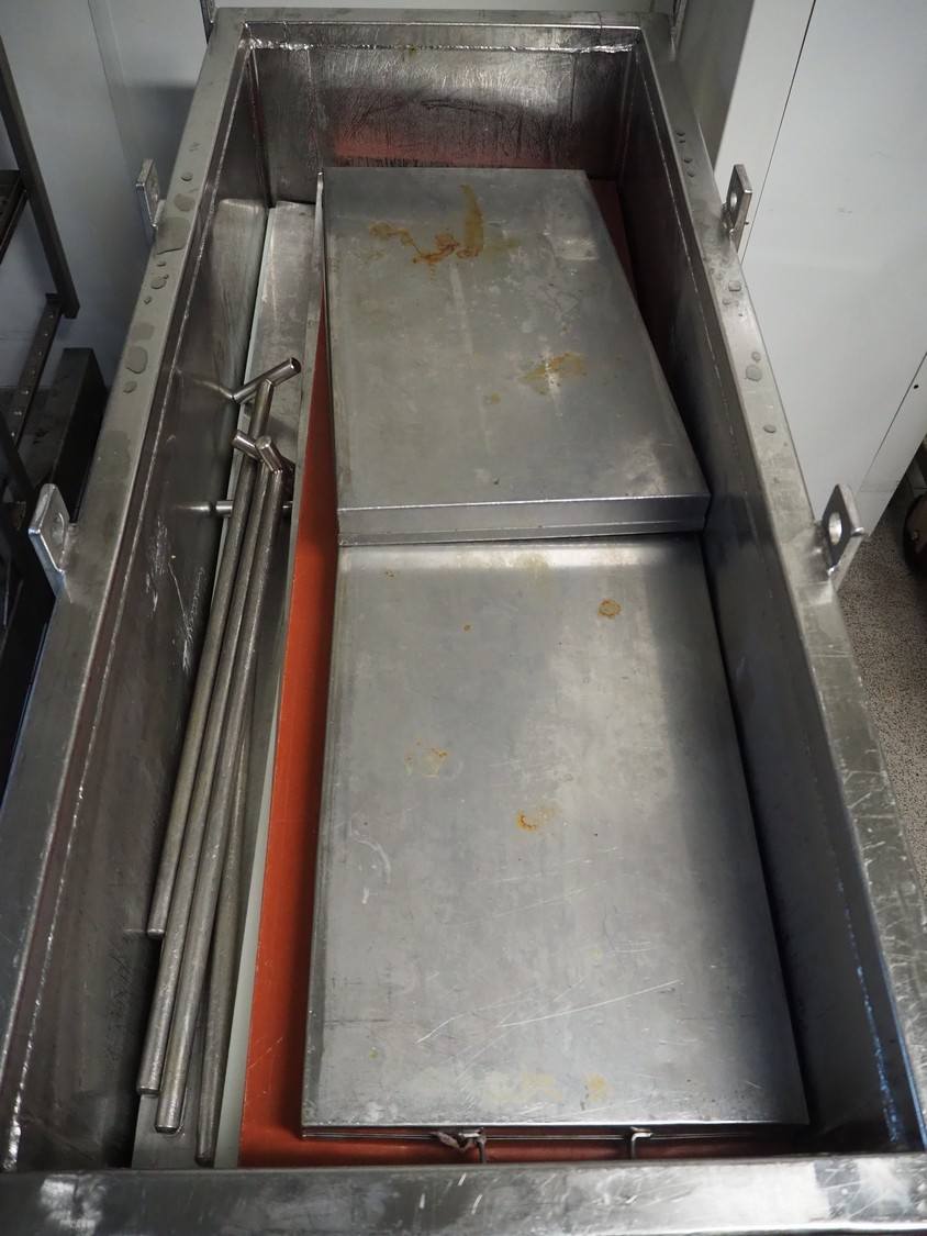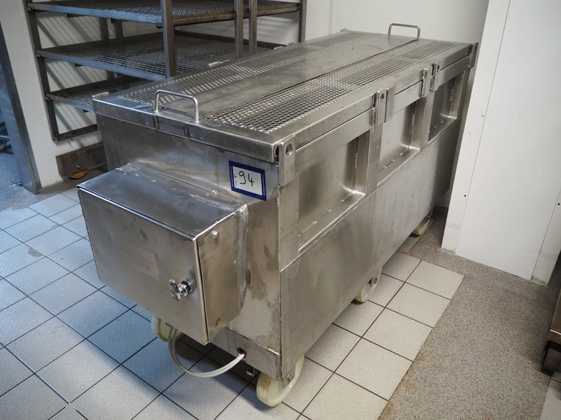 Eberhardt GmbH mobile ham press, inside dimensions: 1300 mm x 510 mm, total dimensions: 1550 mm x 620 mm x 930 mm. Including various s/s and plastic plates.