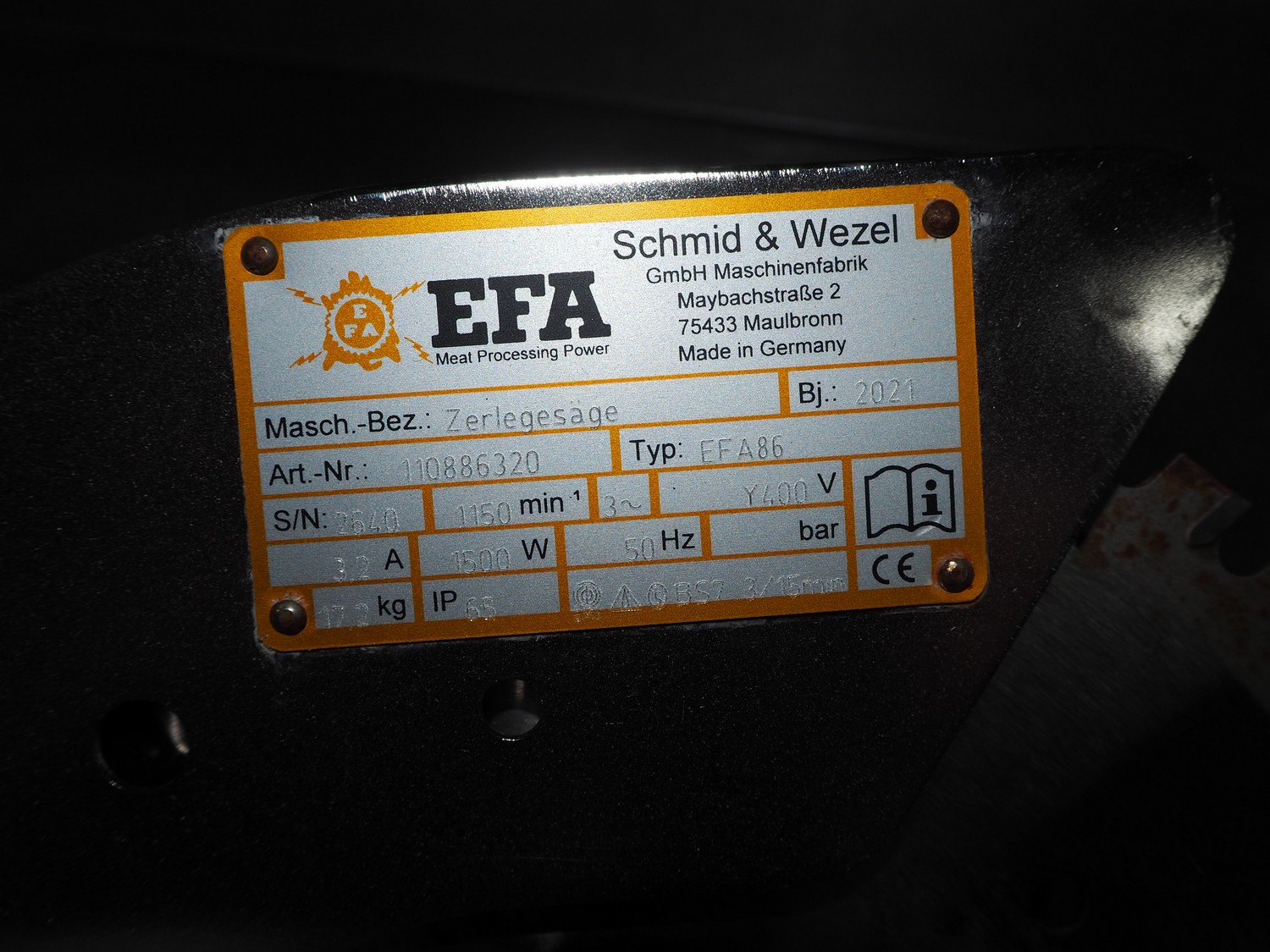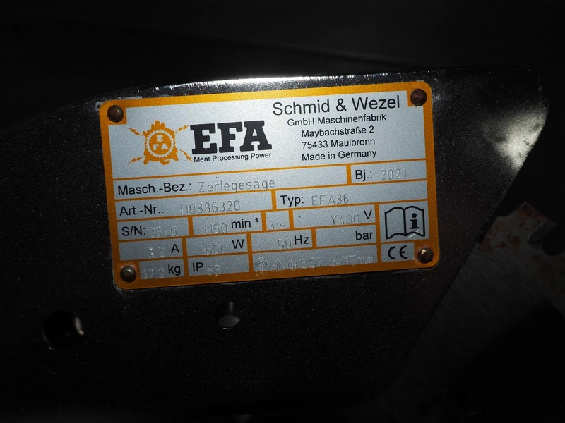 EFA breaking saw, machine type: Zerlegesäge, type: EFA 86, serial number: 2640, year of construction: 2021, 400 V, 3 Ph, 50 Hz, 1500 W, 1150 rates per minute, dimensions: 650 mm x 250 mm x 250 mm.