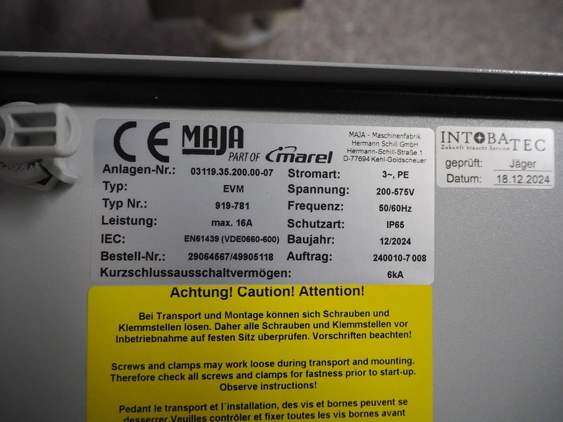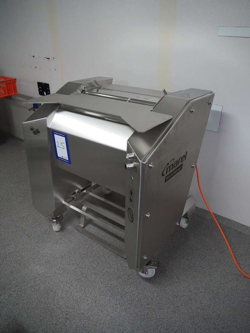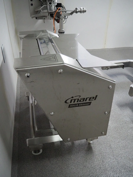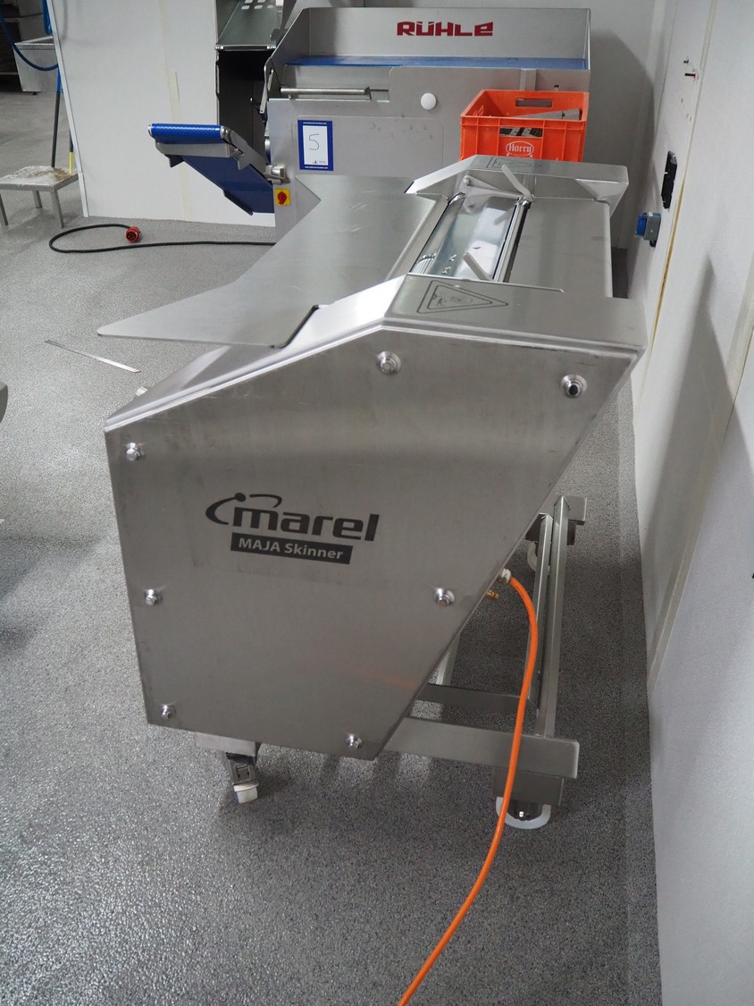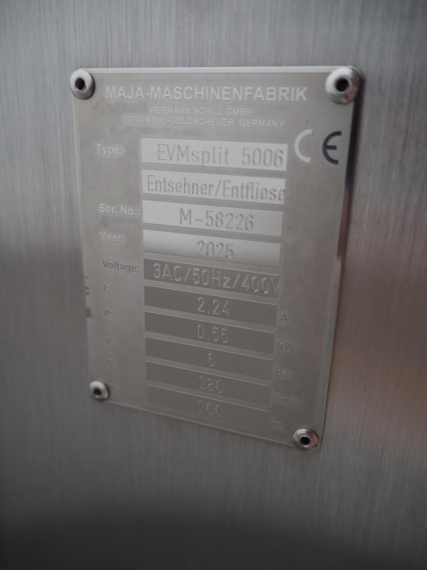 Maja-Maschinenfabrik mobile skinning machine, type: EVMsplit 5006, serial number: M-58226, year of construction: 2025, 400 V, 3 Ph, 50 Hz, 2.24 A, 0.55 kW, 6 bar, 280 liter per minute, weight: 200 kg, working width: 540 mm, foot control, total dimensions: 1000 mm x 750 mm x 1050 mm.