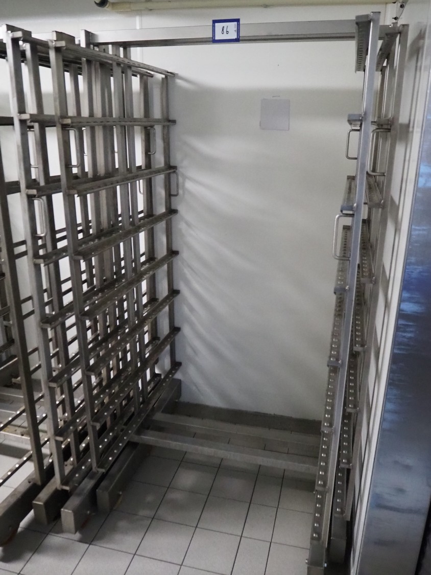 2 s/s smoke trolleys, 8 floors, dimensions floors: (8x) 930 mm x 980 mm, total dimensions: (2x) 1050 mm x 990 mm x 1980 mm.