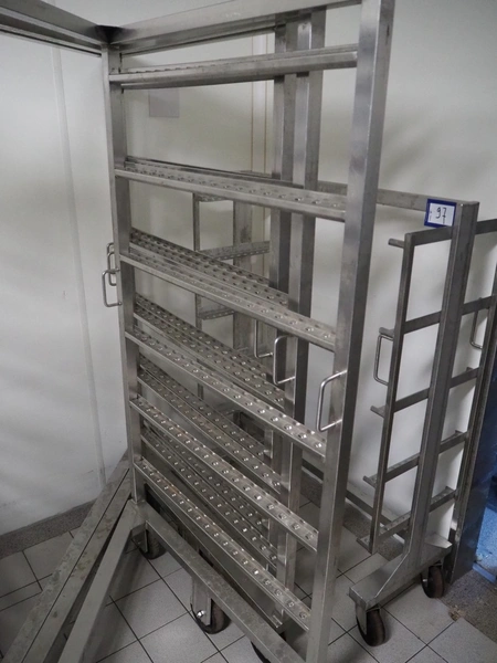 3 s/s smoke trolleys, Z-model, 6 floors, dimensions floors: (6x) 1000 mm x 940 mm, total dimensions: (3x) 1020 mm x 1020 mm x 1900 mm.