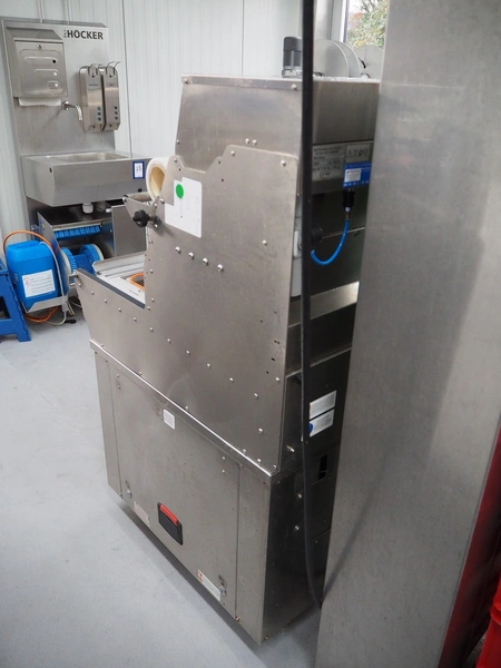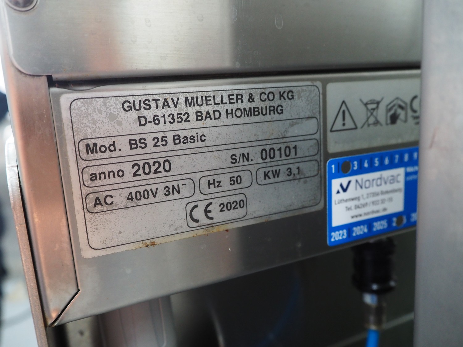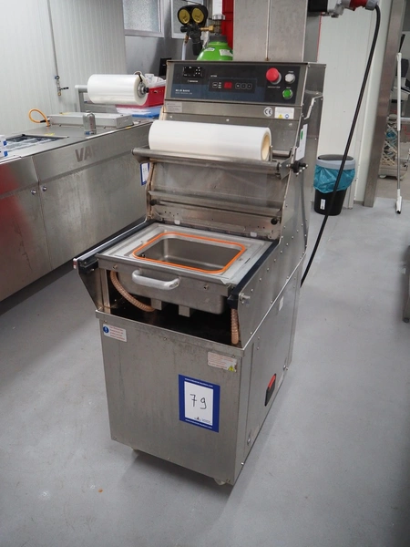 Gustav Mueller & Co KG / Boss mobile traysealer, model: BS 25 Basic, serial number: 00101, year of construction: 2020, 400 V, 3 Ph, 50 Hz, 3.1 kW, dye: (1x) 303 mm x 243 mm - for 1/2 GN trays, film width: 380 mm, vacuum and gasflush, Busch vacuum pump, type: KB 0040 D I00, year of construction: 2013, capacity: 40 m³ per hour, dimensions: 600 mm x 920 mm x 1450 mm. Complete overhauled in 2024.