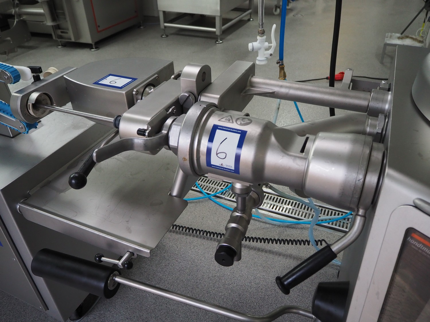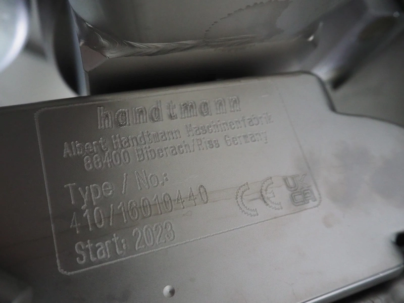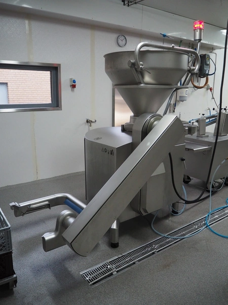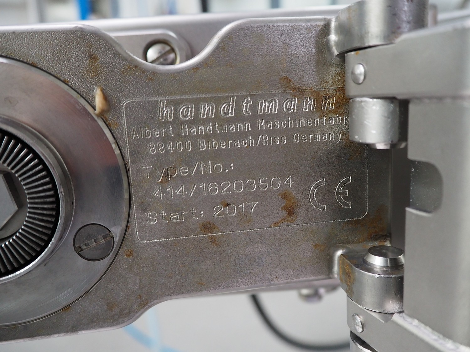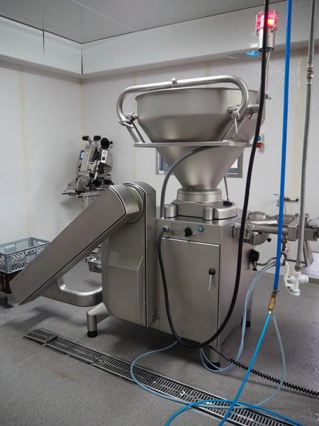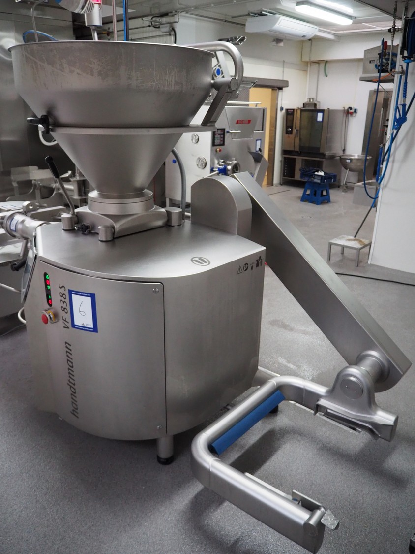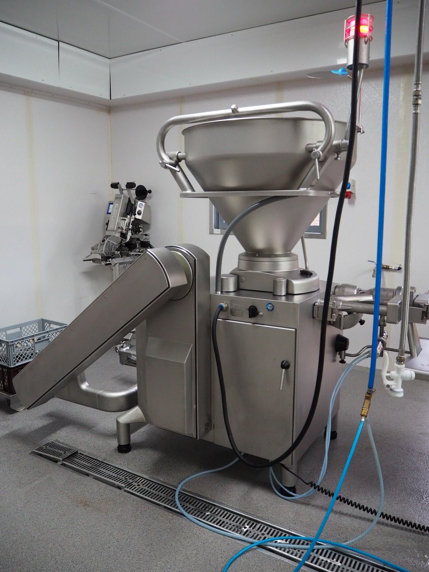 Handtmann vacuum filling machine with lifter for 200 liter meat bins, type: VF 838 S, number: 50436, year of construction: 2023, Handtmann grinding head, model: 451, number: 20001381, year of construction: 2024, Handtmann linking and case holding device, type number: 414/16203504, year of construction: 2017 and type number: 410 / 1601044, year of construction: 2023, total dimensions vacuum filling machine: 2000 mm x 1600 mm x 2200 mm. Including some crates with parts. Vacuum filling machine needs to be removed by crane.