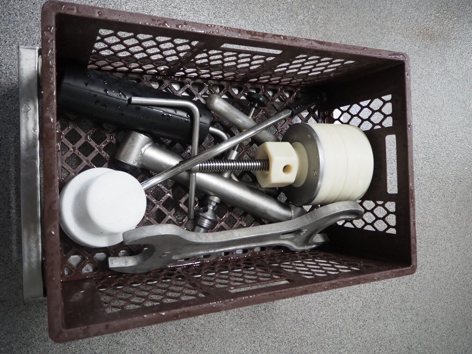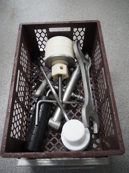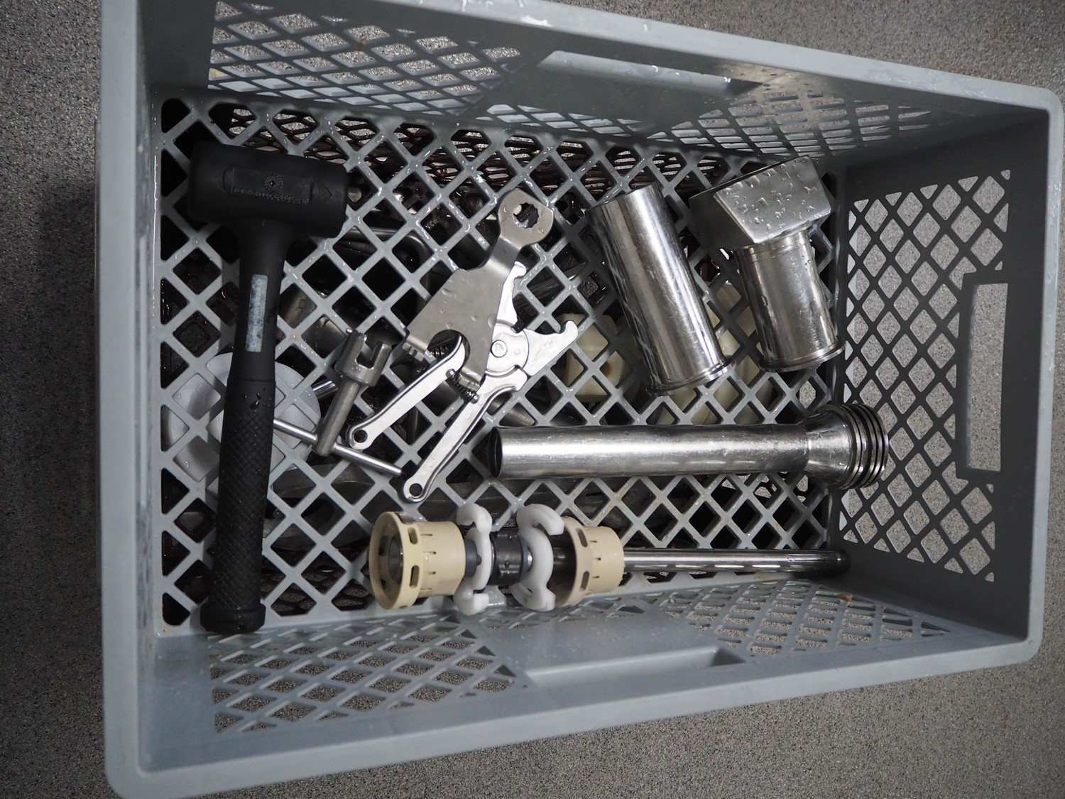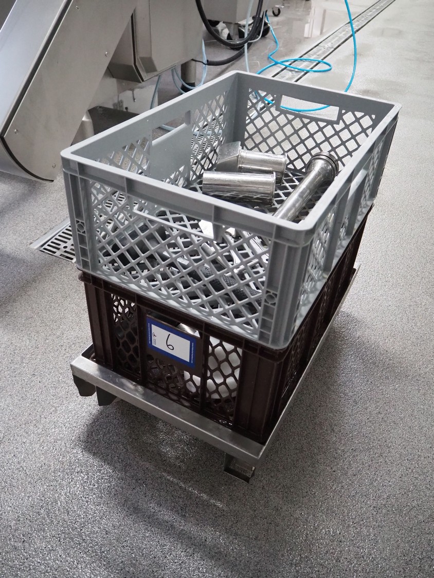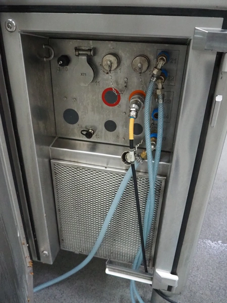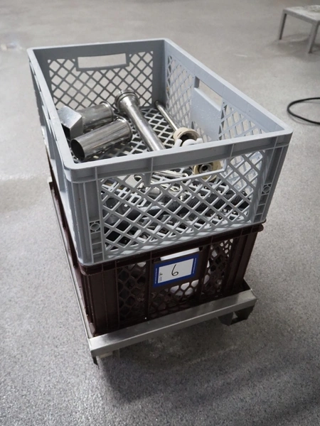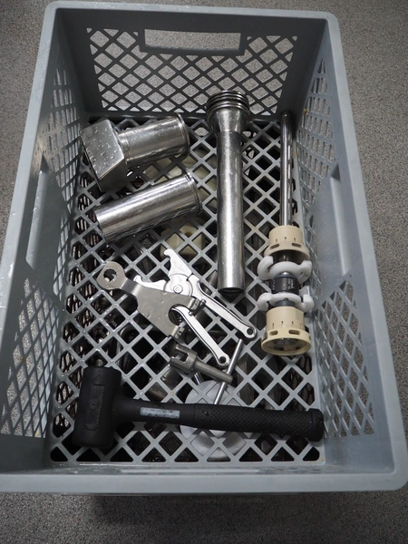 Handtmann vacuum filling machine with lifter for 200 liter meat bins, type: VF 838 S, number: 50436, year of construction: 2023, Handtmann grinding head, model: 451, number: 20001381, year of construction: 2024, Handtmann linking and case holding device, type number: 414/16203504, year of construction: 2017 and type number: 410 / 1601044, year of construction: 2023, total dimensions vacuum filling machine: 2000 mm x 1600 mm x 2200 mm. Including some crates with parts. Vacuum filling machine needs to be removed by crane.
