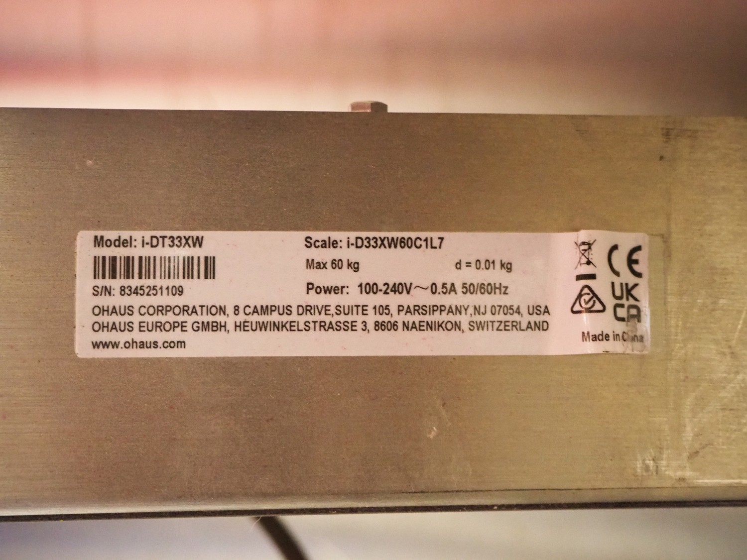 Ohaus Corporation weighing scale, model scale: i-D60C1L, serial number: 8345251109, capacity: 60 kg, model indicator: i-DT33XW, serial number: 8345251109, maximum: 60 kg, d = 0.01 kg, 100-240 V, 1 Ph, 50/60 Hz, 0.5 A, dimensions scale: 430 mm x 550 mm, total dimensions: 430 mm x 700 mm x 550 mm.
