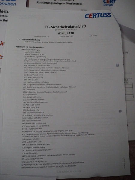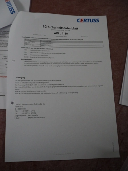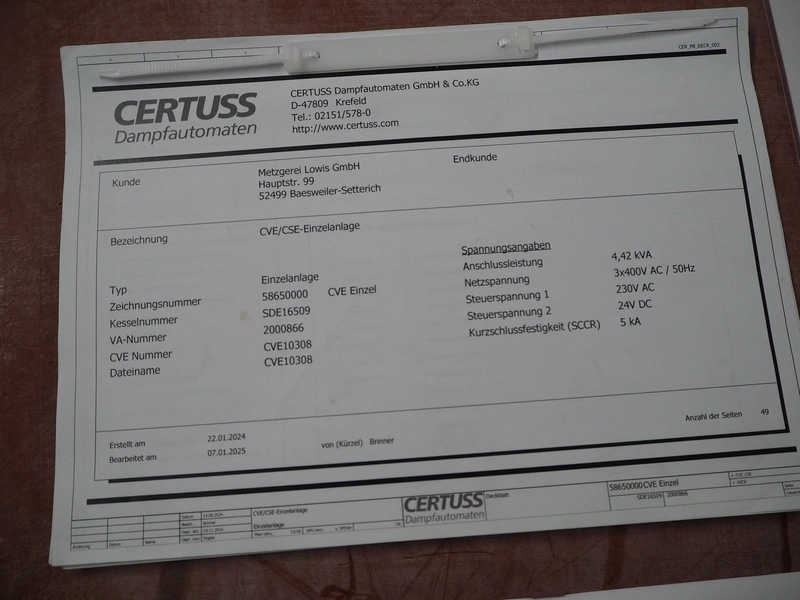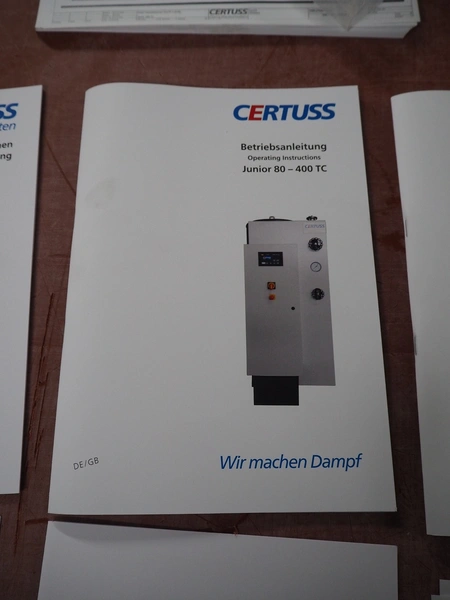 Certuss GmbH steam generator, model: CERTUSS Junior 300 TC, production number: SDE16509, year of construction: 2024, capacity: 300 kg per hour, maximum working pressure: 10 bar, maximum working temperature: 184˚C, volume in liter: 32.48 liter, test pressure: 57 bar, dimensions: 1000 mm x 1500 mm x 2000 mm, Certuss GmbH CVE package plant unit, type: CERTUSS CVE 300 TC, serial number CVE10308, year of construction: 2025, 230 V, 50 Hz, 16 A, 4.42 kVa, dimensions: 1500 mm x 1000 mm x 2000 mm.