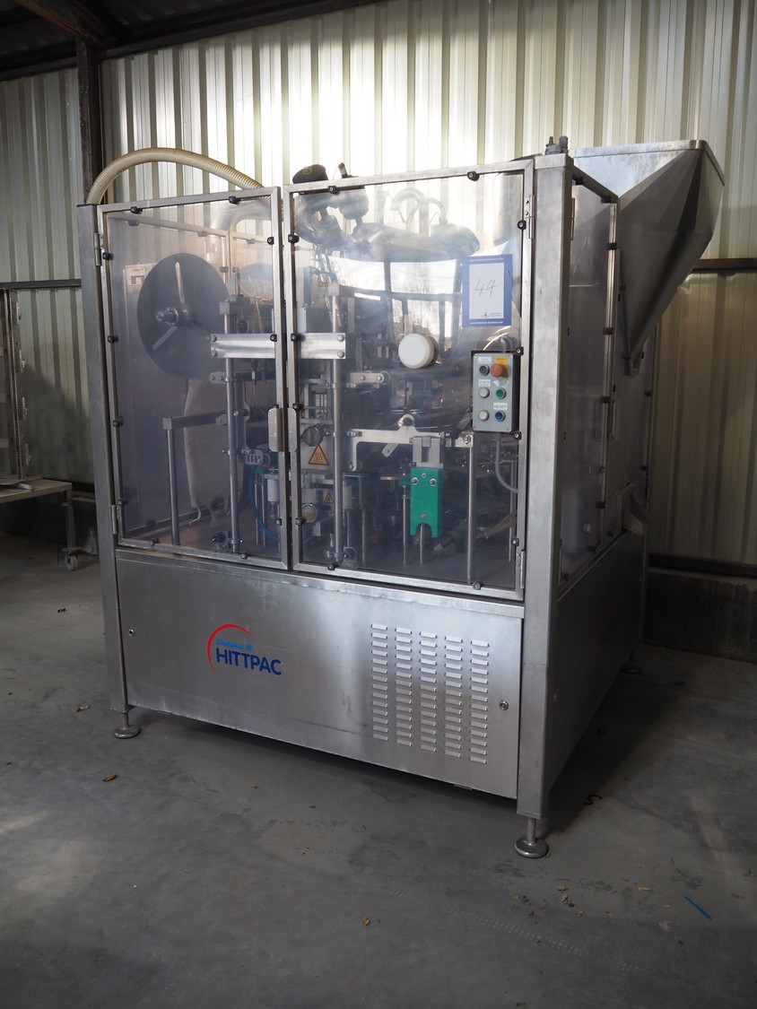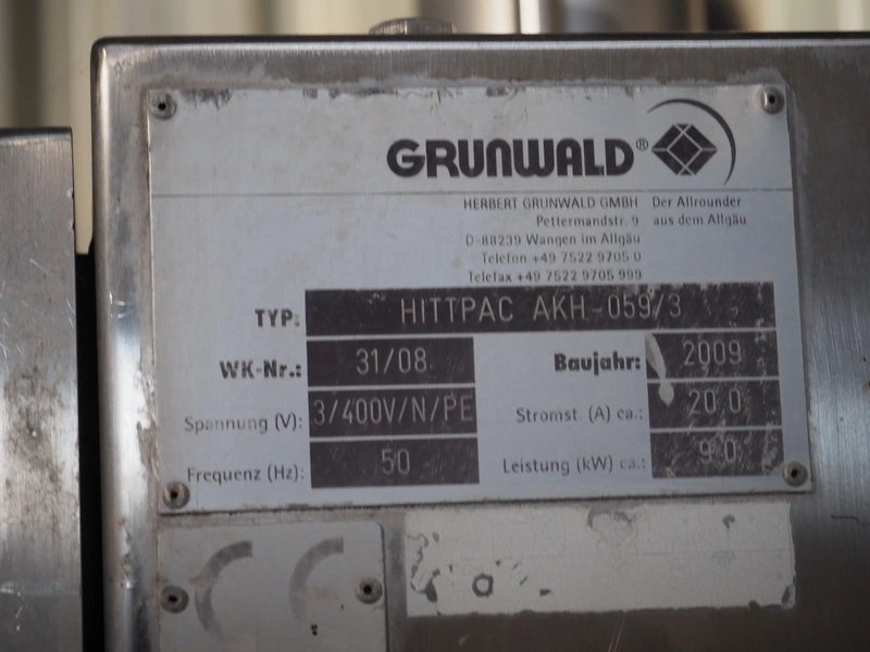 Herbert Grunwald GmbH cup filling, sealing and lidding machine, type: HITTPAC AKH-059/3, work number: 31/08, year of construction: 2009, 400 V, 3 Ph, 50 Hz, 20.0 A, 9.0 kW, Busch vacuum pump, type: RA 0100 F 503, number: 080086618, year of construction: 2008, capacity: 100 m³ per hour, dimensions cups: 113 mm x 83 mm, total dimensions: 2200 mm x 1750 mm x 2210 mm.