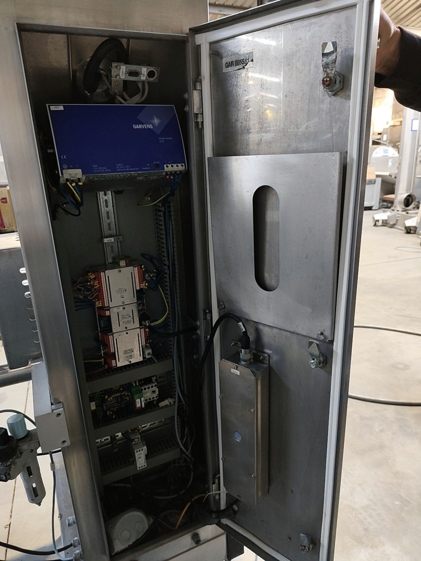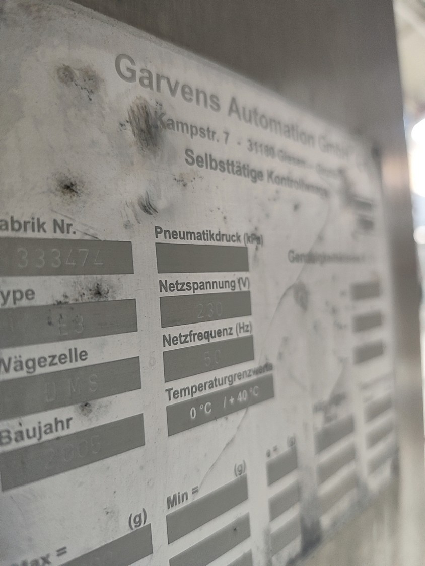 Garvens checkweigher with rejector, model E3, serial number: 333474, year of construction: 2005, 230 V, 50 Hz, weigher: DMS, dimensions: 1340 mm x 850 mm x 1680 mm.