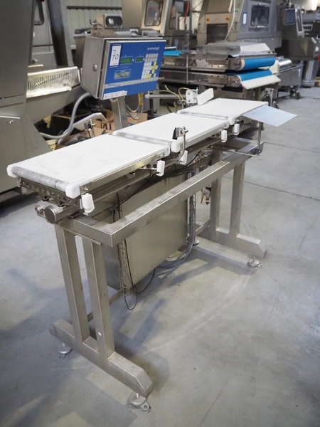 Scanvaegt checkweigher with rejector, type: Powercheck, serial number: 56496, belt width: 315 mm, total dimensions: 1500 mm x 780 mm x 1400 mm. Missing belt.