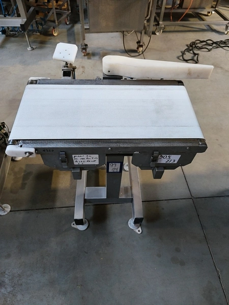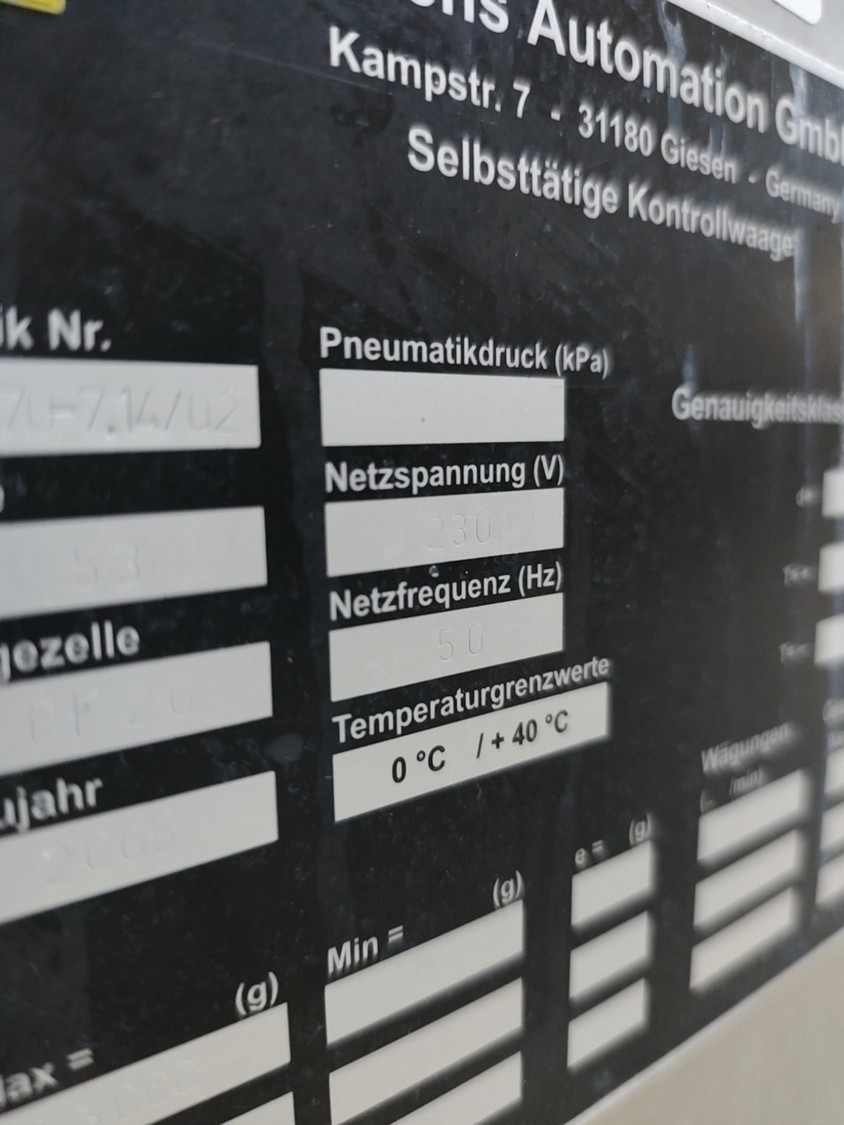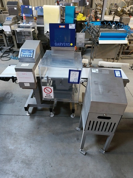 Garvens checkweigher with rejectior, model E3, serial number: 333470-7.14/02, year of construction: 2005, 230 V, 50 Hz, weigher TF-20 dimensions: 1800 mm x 1100 mm x 1520 mm. Including transport belt with rejectors, dimensions 600 mm x 700 mm x 1050 mm and waste bin, dimensions 400 mm x 370 mm x 1100 mm.