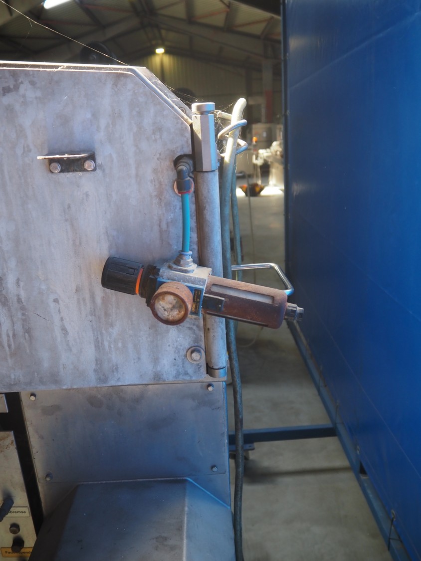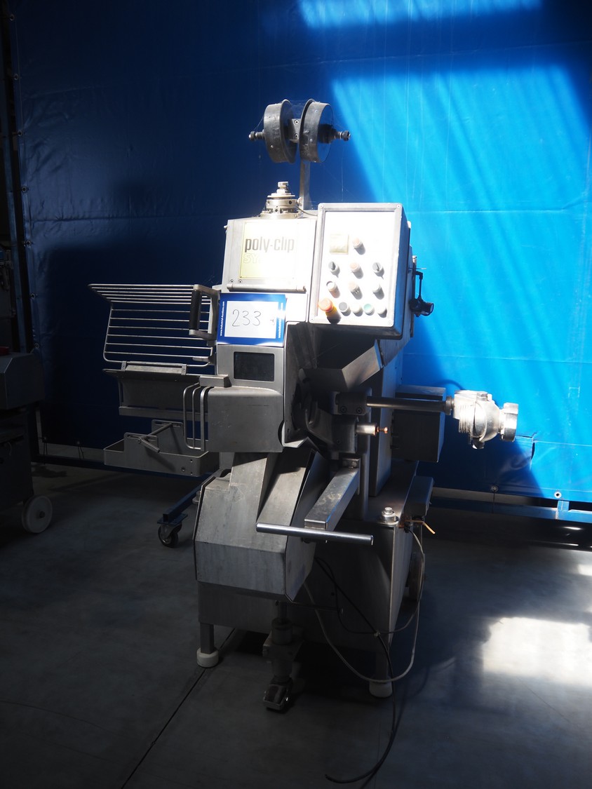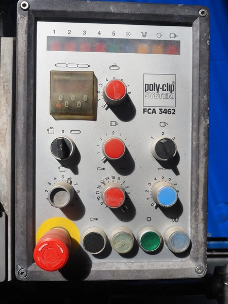 Poly-clip System GmbH & Co. KG automatic double clipper, type: FCA 3452, serial number: 571/02, year of construction: 2010, 400 V, 3 Ph, 50/60 Hz, 50 A, 3.8 kW, 5-7 bar, dimensions: 1250 mm x 1100 mm x 2120 mm. Missing outfeed conveyor. Technical conditions unknown.