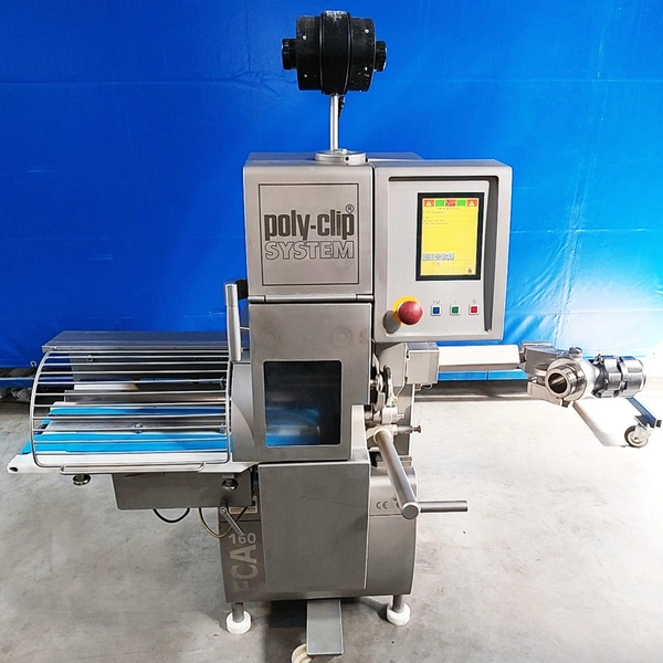 Poly-clip System GmbH & Co. KG automatic double clipper, model: FCA 160, 3x400 V, 50/60 Hz, 6.0 A, 4.0 kW, 5-7 bar, 625 kg, dimensions: 1500 mm x 1200 mm x 1900 mm.