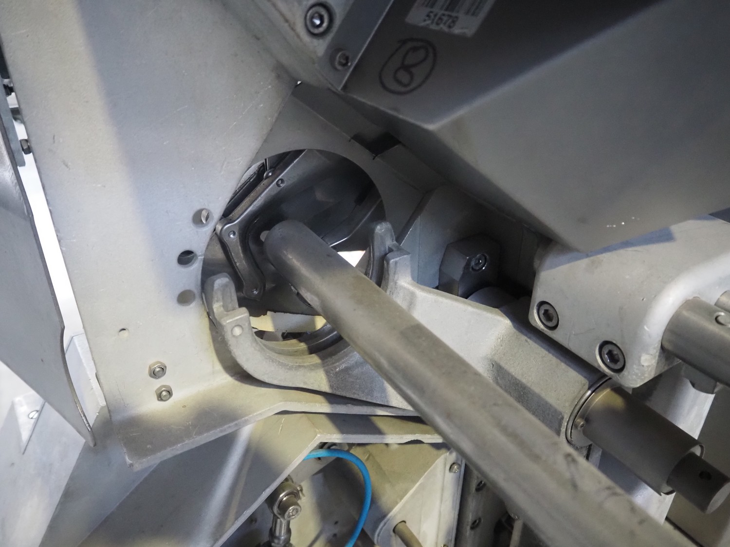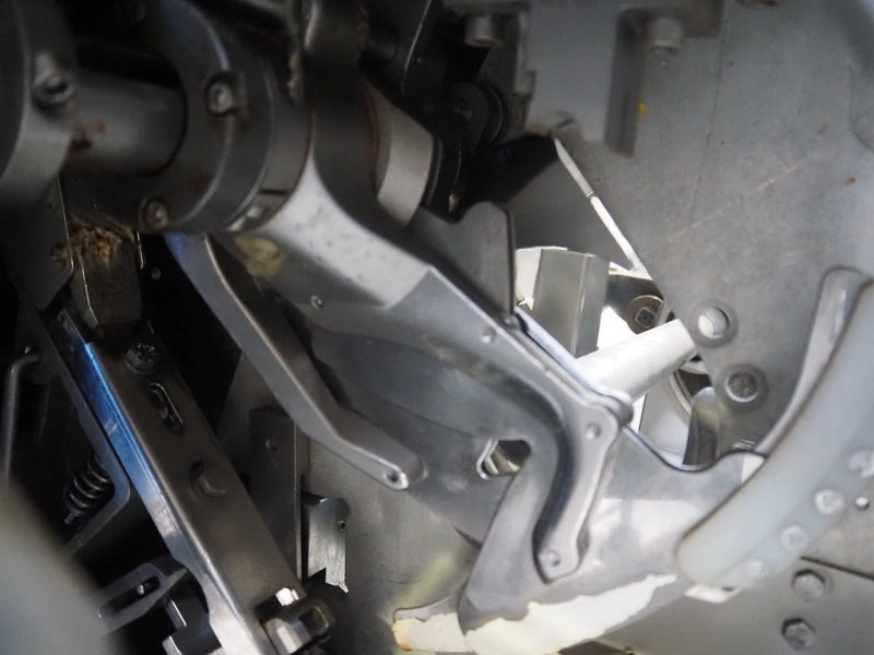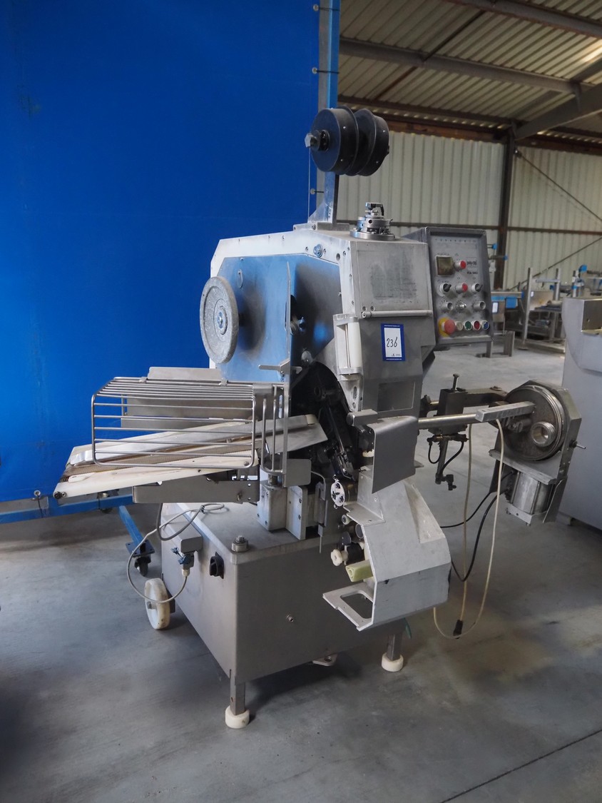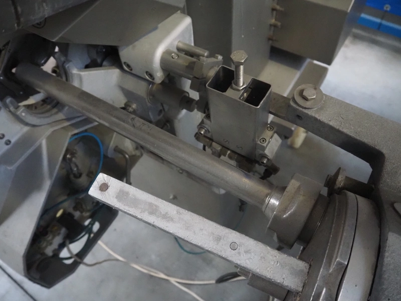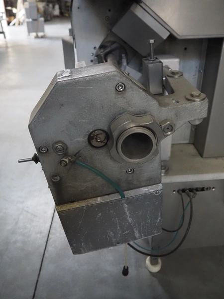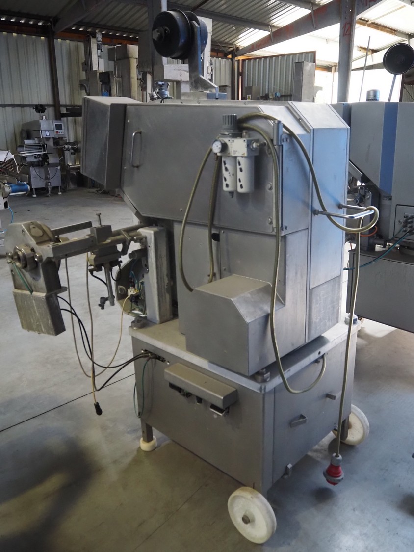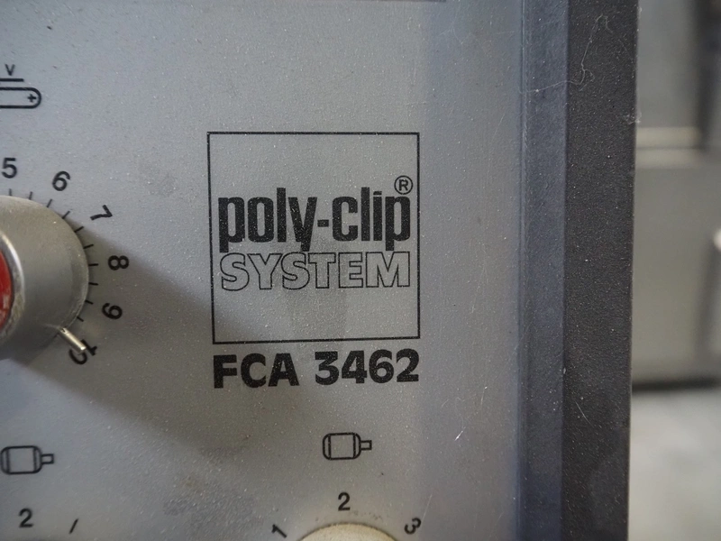 Poly-clip System GmbH & Co. KG automatic double clipper, type: FCA 3462, plastic belt, belt width: 50 mm and 75 mm, dimensions: 1300 mm x 1100 mm x 2000 mm.