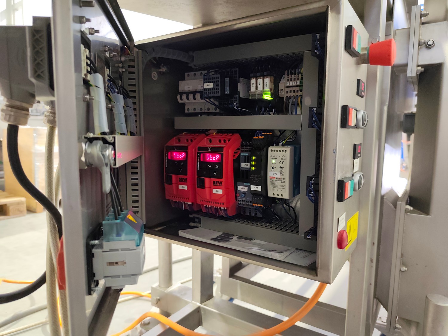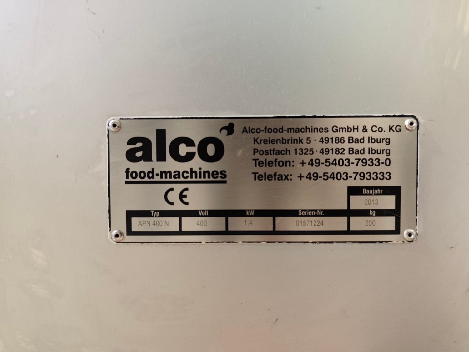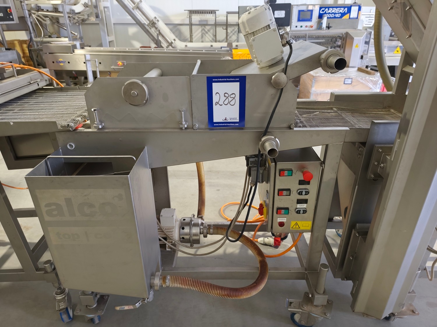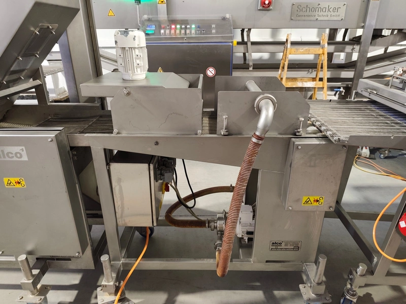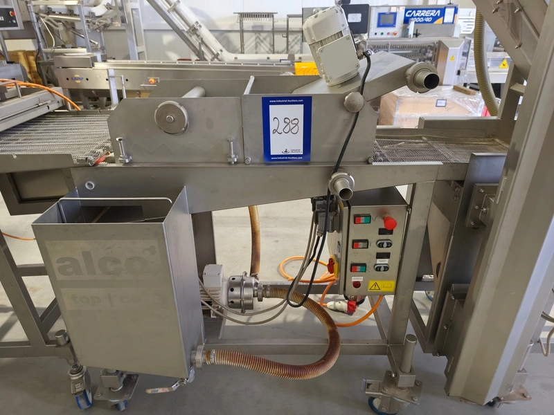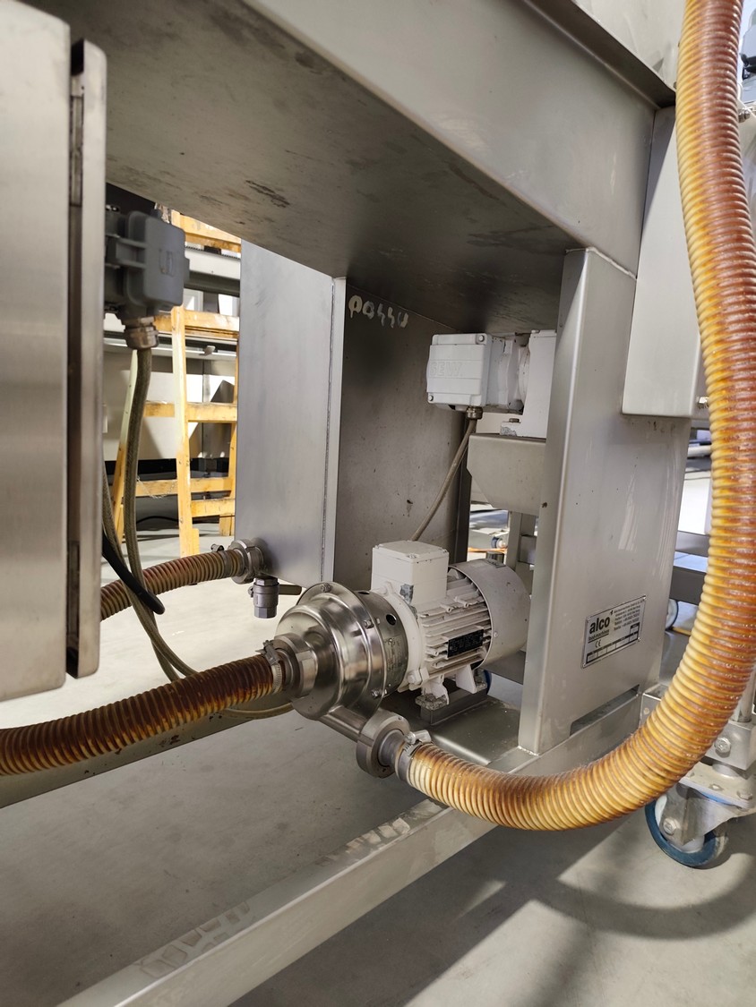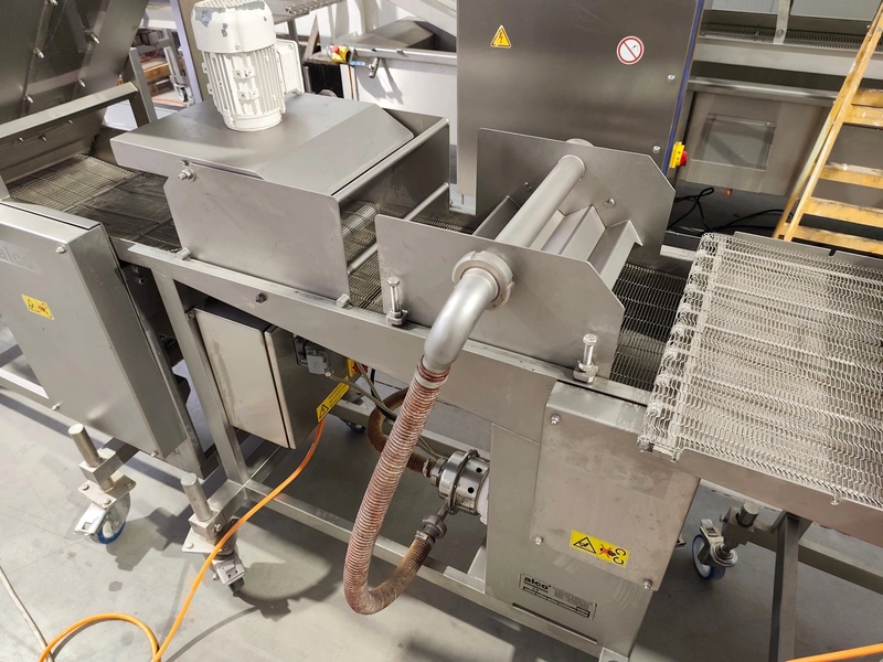 Alco-food-machines GmbH & Co. KG mobile battering machine, type: APN 400 N, serial number: 01571224, year of construction: 2013, 400 V, 1.4 kW, weight: 200 kg, s/s mesh belt, belt width: 400 mm, , total dimensions: 1550 mm x 850 mm x 1500 mm.