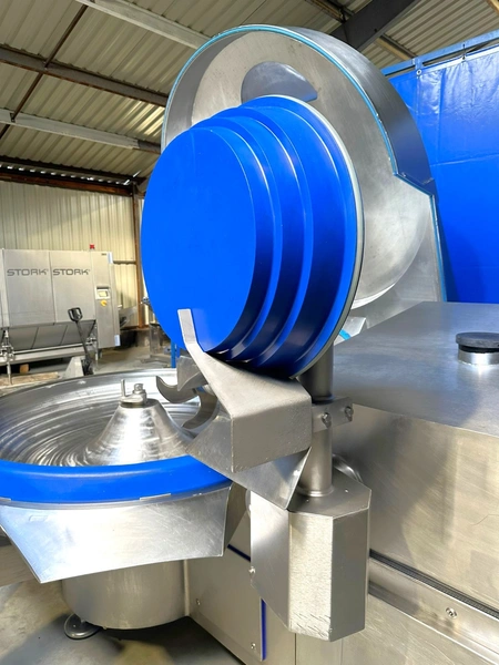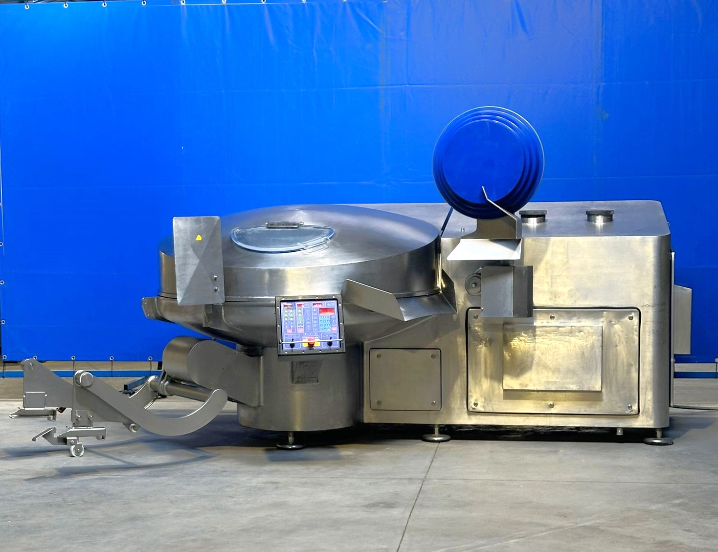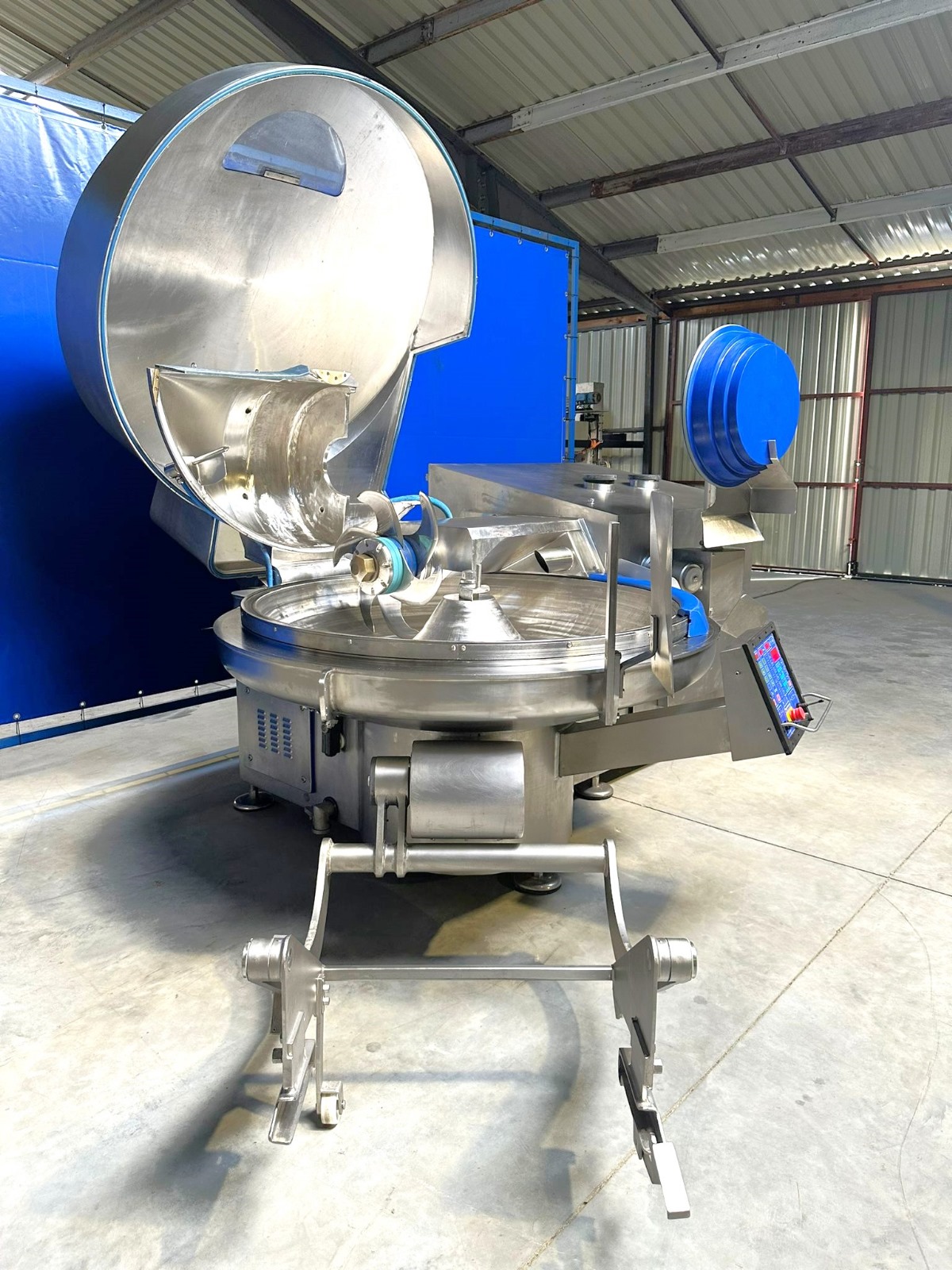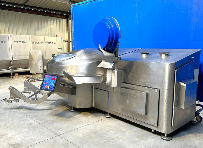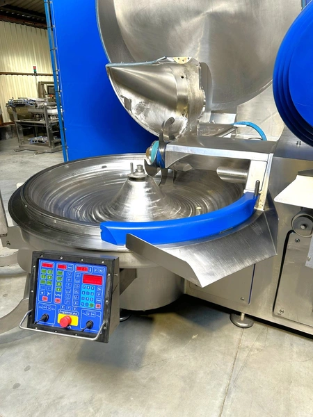 Krämer + Grebe vacuum bowl cutter with lifter for 200 liter meat bins and ejector, volume: 325 liter, dimensions: 4250 mm x 2950 mm x 2080 mm. Including vacuum pump and two pallets with extra parts.