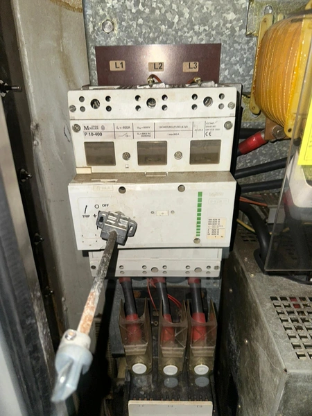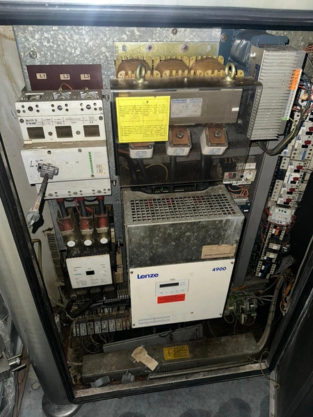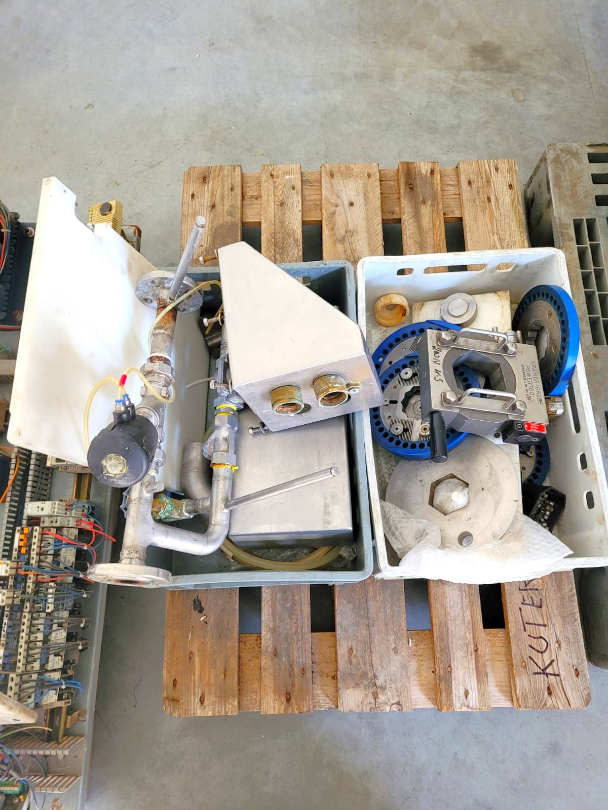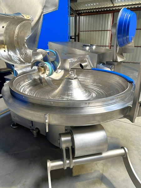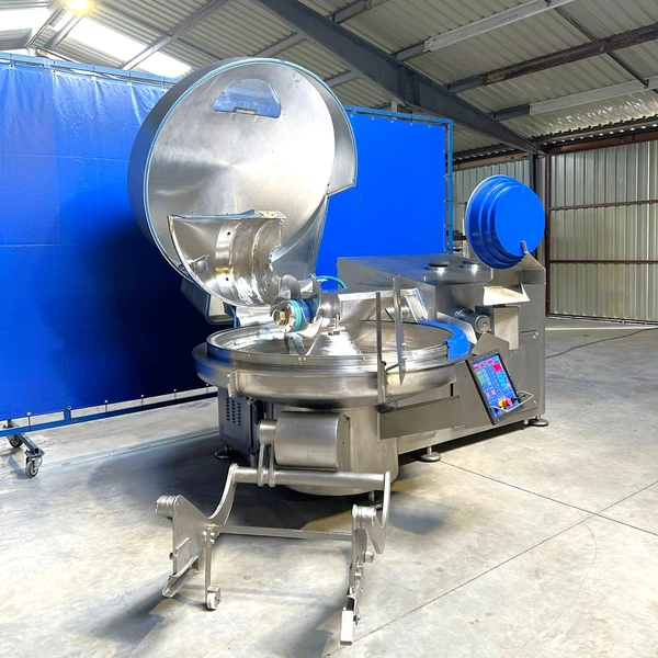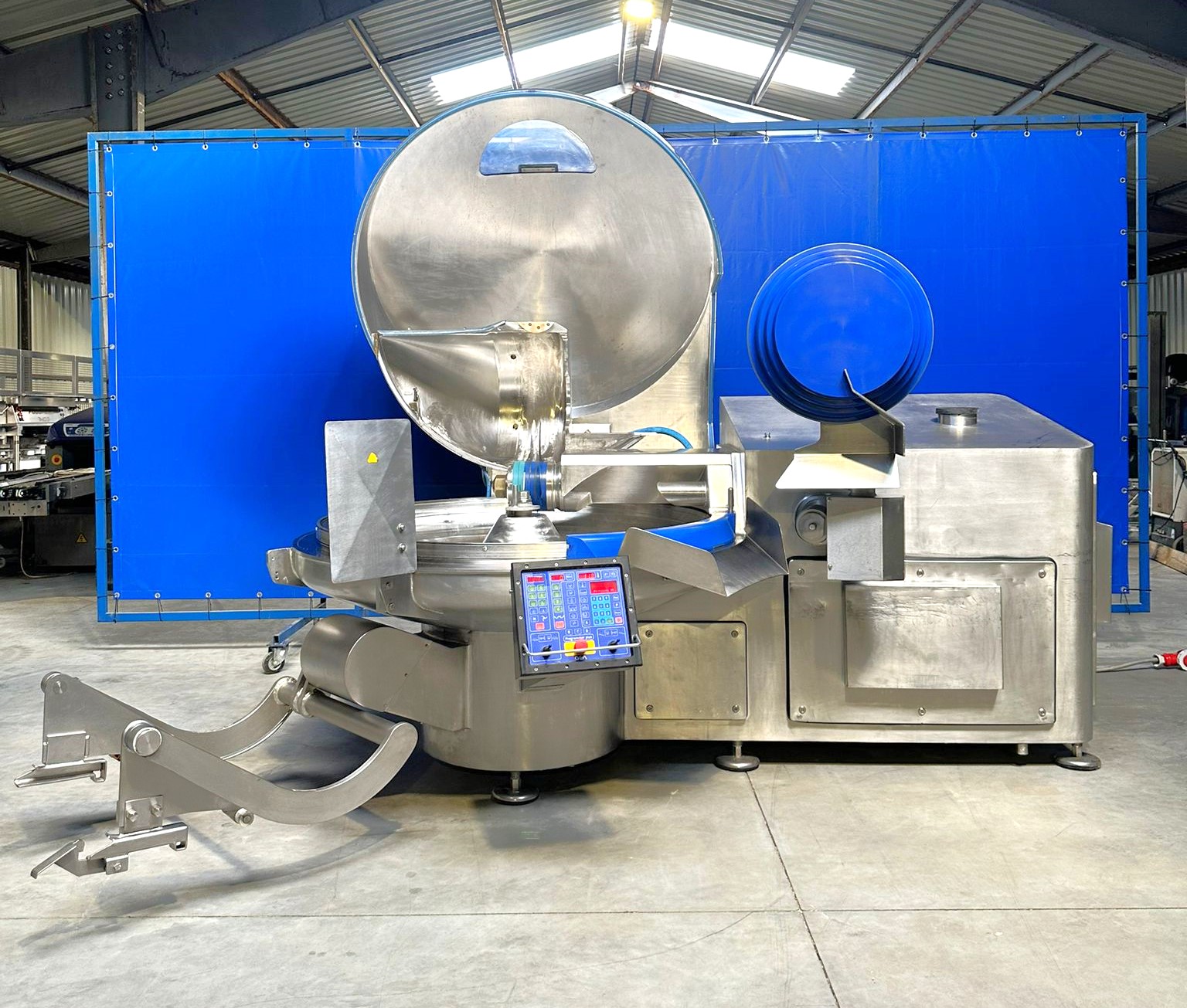 Krämer + Grebe vacuum bowl cutter with lifter for 200 liter meat bins and ejector, volume: 325 liter, dimensions: 4250 mm x 2950 mm x 2080 mm. Including vacuum pump and two pallets with extra parts.