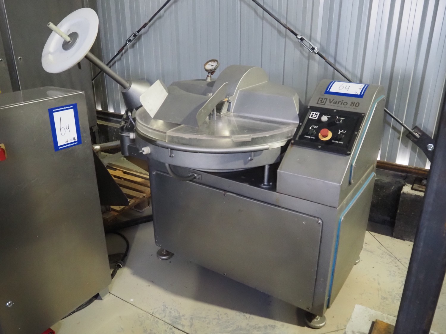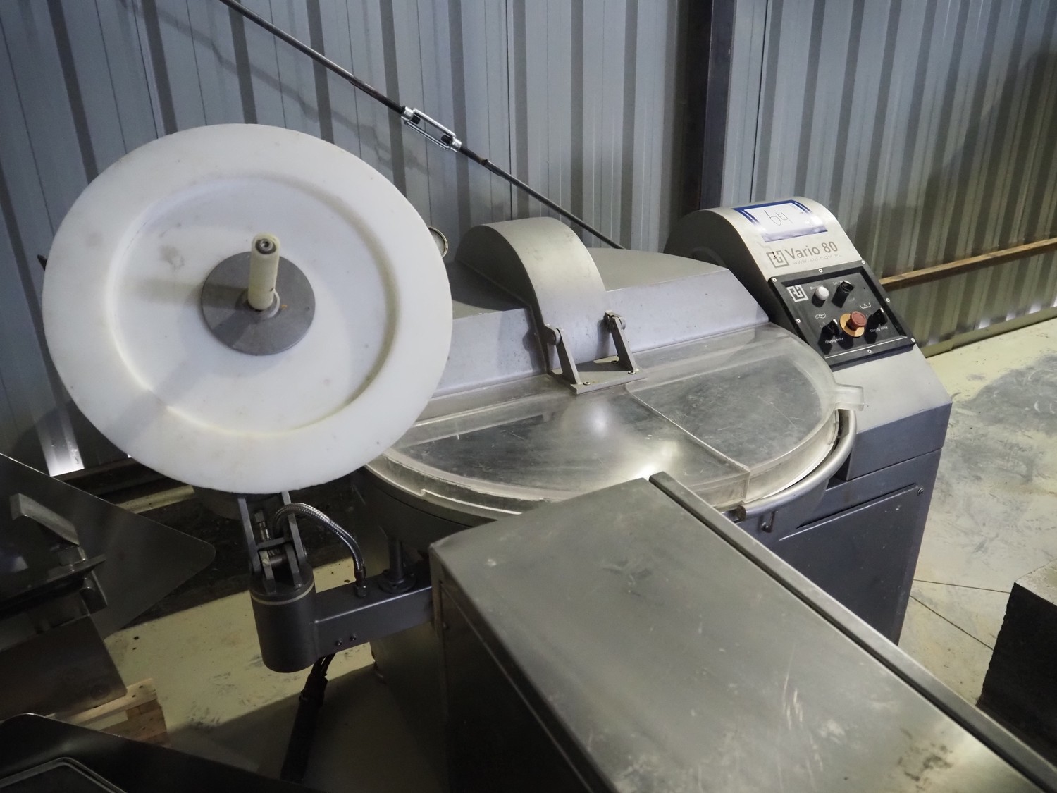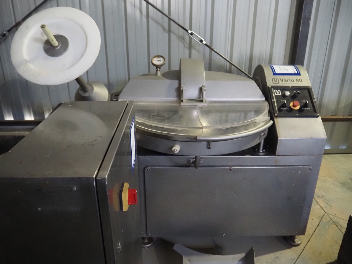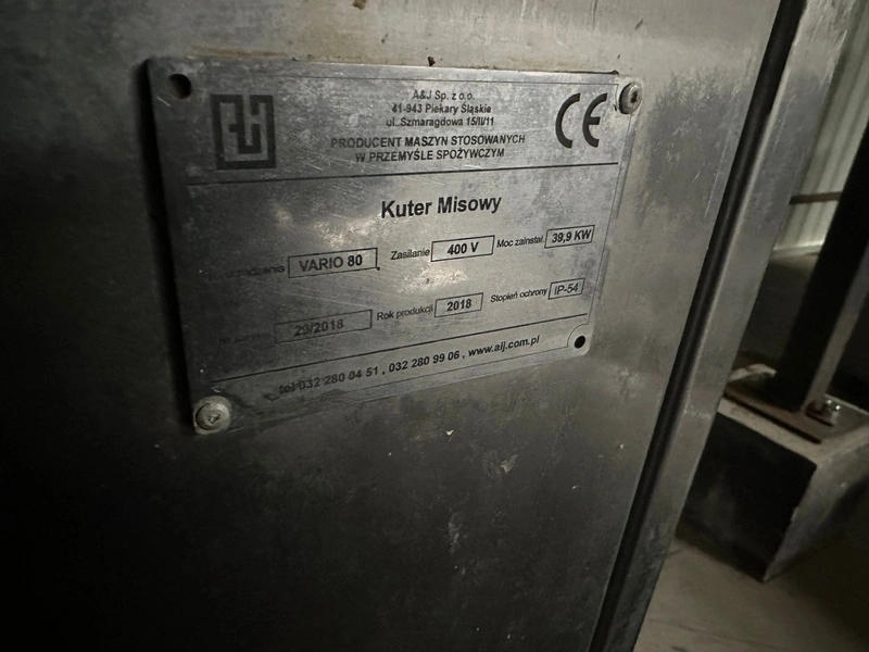 A&J Sp. Z.o.o. bowl cutter with ejector, type: VARIO 80, year of construction: 2018, 400 V, 39.9 kW, volume: 80 liter, dimensions: 1700 mm x 1200 mm x 1600 mm. Including switch cabinet, dimensions: 650 mm x 350 mm x 1210 mm.