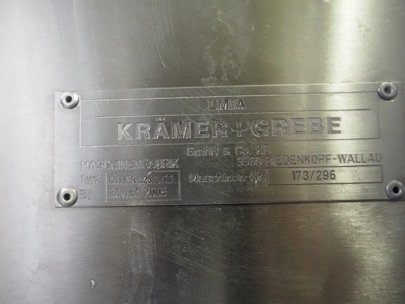 Krämer + Grebe bowl cutter with lifter for 200 liter meat bins and ejector, type: Cutter 325 L STL, serial number: 173/296, revised in 2005, s/s bowl and knives, volume: 325 liter, dimensions: 3000 mm x 2200 mm x 1900 mm. Including switch cabinet, dimensions: 1700 mm x 600 mm x 2000 mm and lifter, dimensions: 1800 mm x 1200 mm x 800 mm.