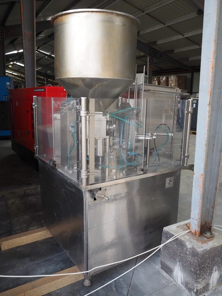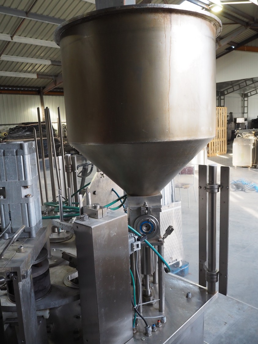 Unipak cup filling machine, type: PKG-2, year of construction: 1997, dimensions cups: 105 mm x 105 mm, dimensions lid: 115 mm x 115 mm, belt width: 170 mm, total dimensions: 2400 mm x 1150 mm x 2000 mm. Missing cover.
