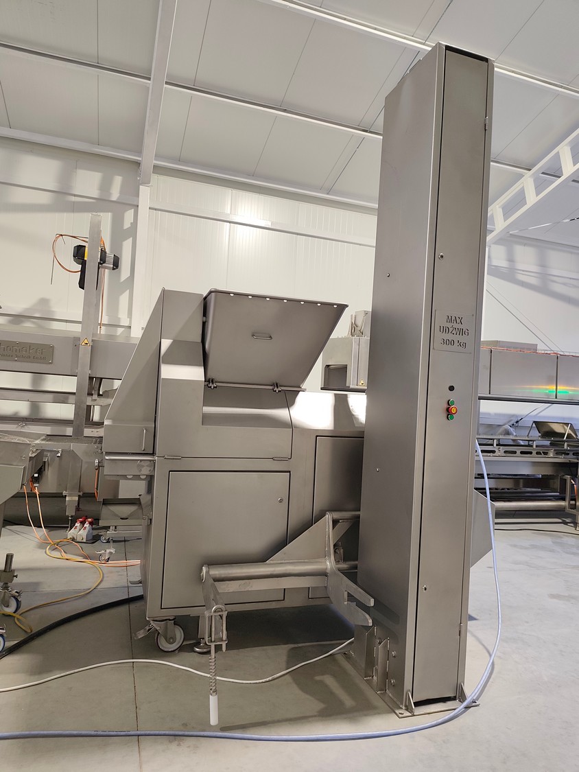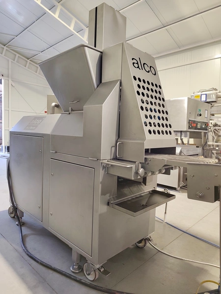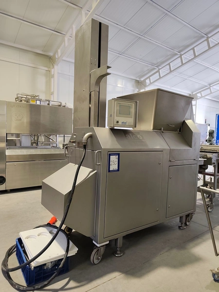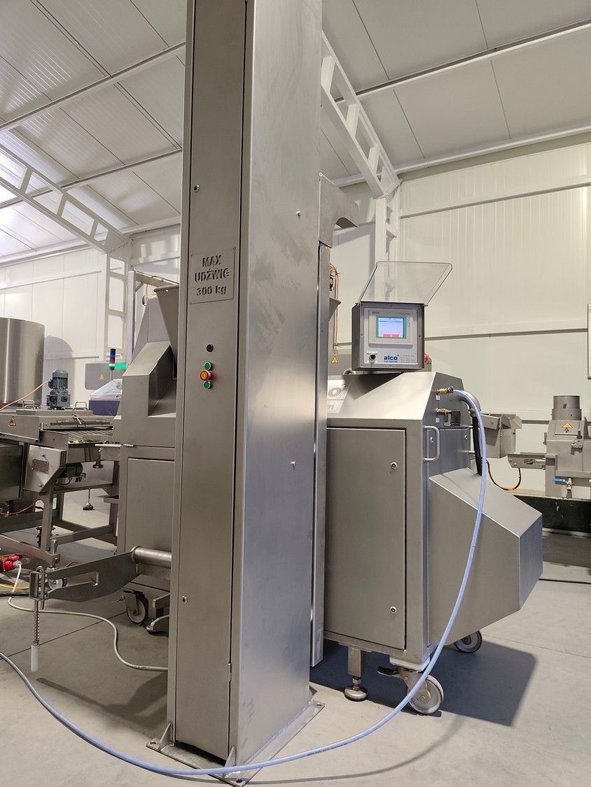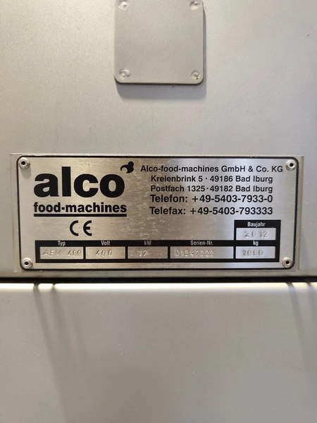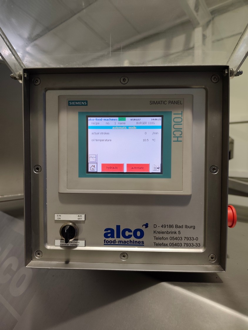 Alco food-machines GmbH & Co. KG mobile forming machine, type: AFM 400 PC, serial number: 01247222, year of construction: 2012, 400 V, 17 kW, weight: 1000 kg, tank capacity: 270 liters, dye width: 400 mm, maximum volume per stroke: ± 1.47 kg, total dimensions: 2800 mm x 800 mm x 1910 mm. Including lifter for 200 liter meat bins, dimensions: 650 mm x 400 mm x 3030 mm. Enabling production of large portions in a short time, maximum number of strokes: 50 per minute, usable molding surface: 370 mm x 130 mm.