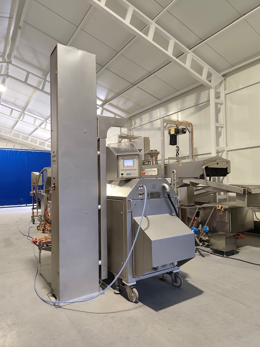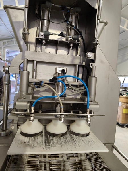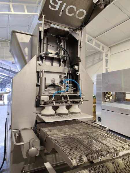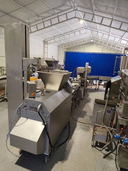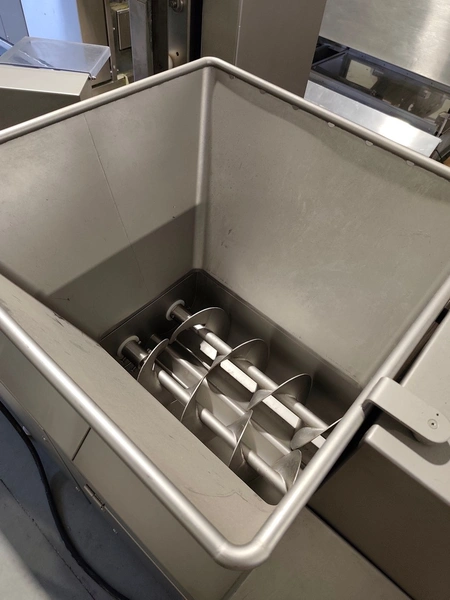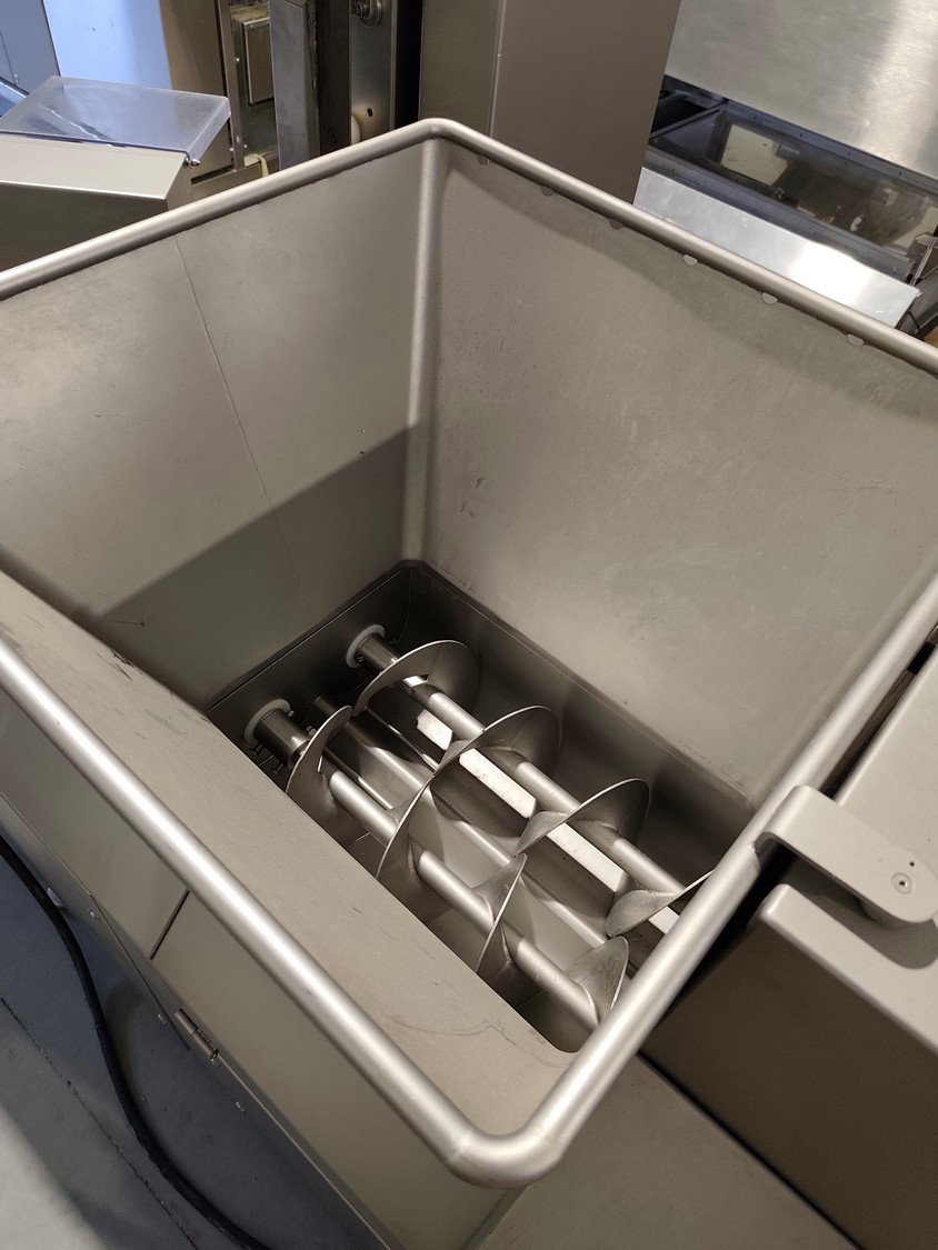 Alco food-machines GmbH & Co. KG mobile forming machine, type: AFM 400 PC, serial number: 01247222, year of construction: 2012, 400 V, 17 kW, weight: 1000 kg, tank capacity: 270 liters, dye width: 400 mm, maximum volume per stroke: ± 1.47 kg, total dimensions: 2800 mm x 800 mm x 1910 mm. Including lifter for 200 liter meat bins, dimensions: 650 mm x 400 mm x 3030 mm. Enabling production of large portions in a short time, maximum number of strokes: 50 per minute, usable molding surface: 370 mm x 130 mm.