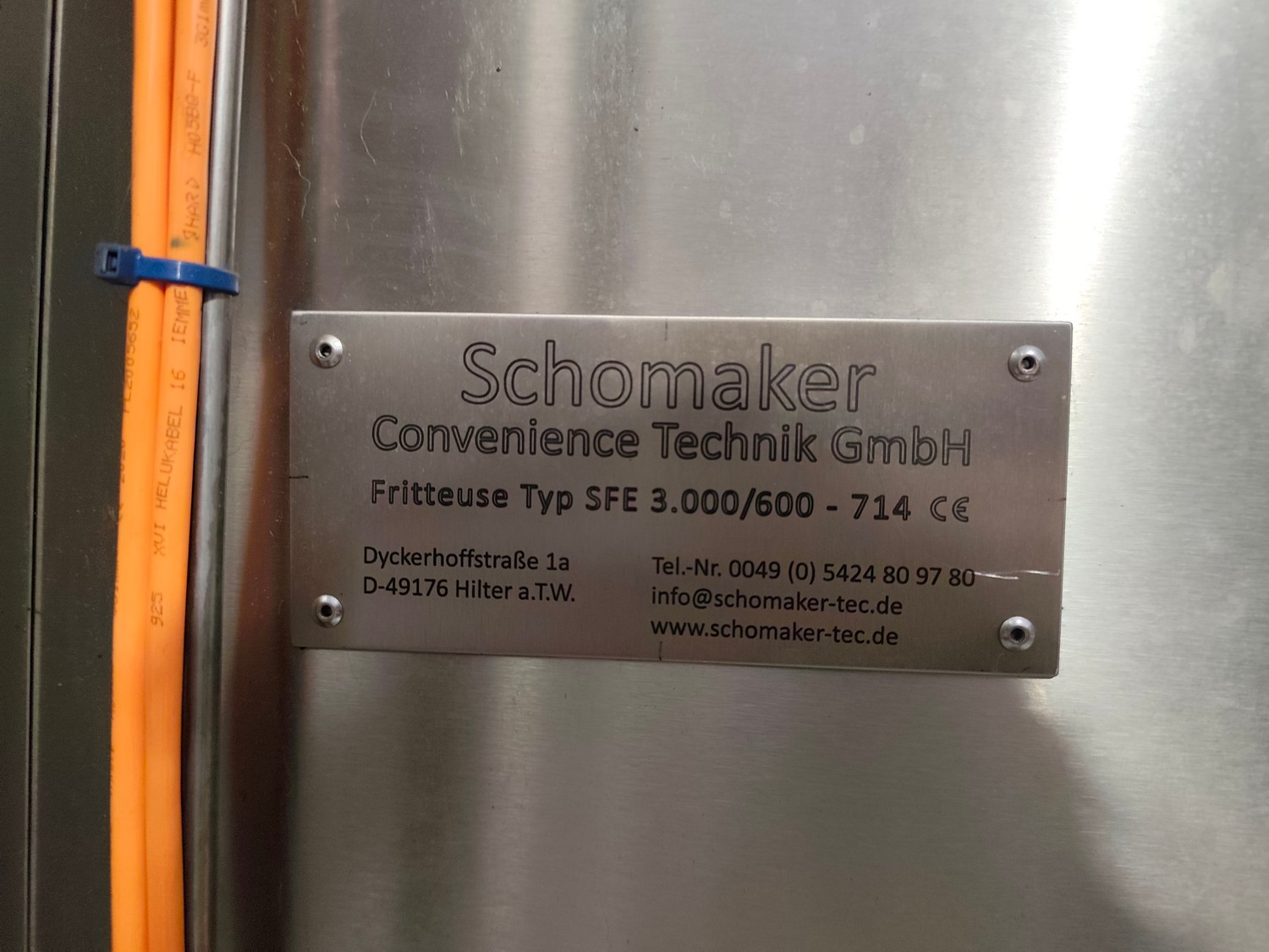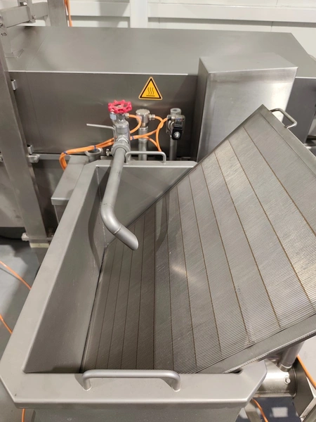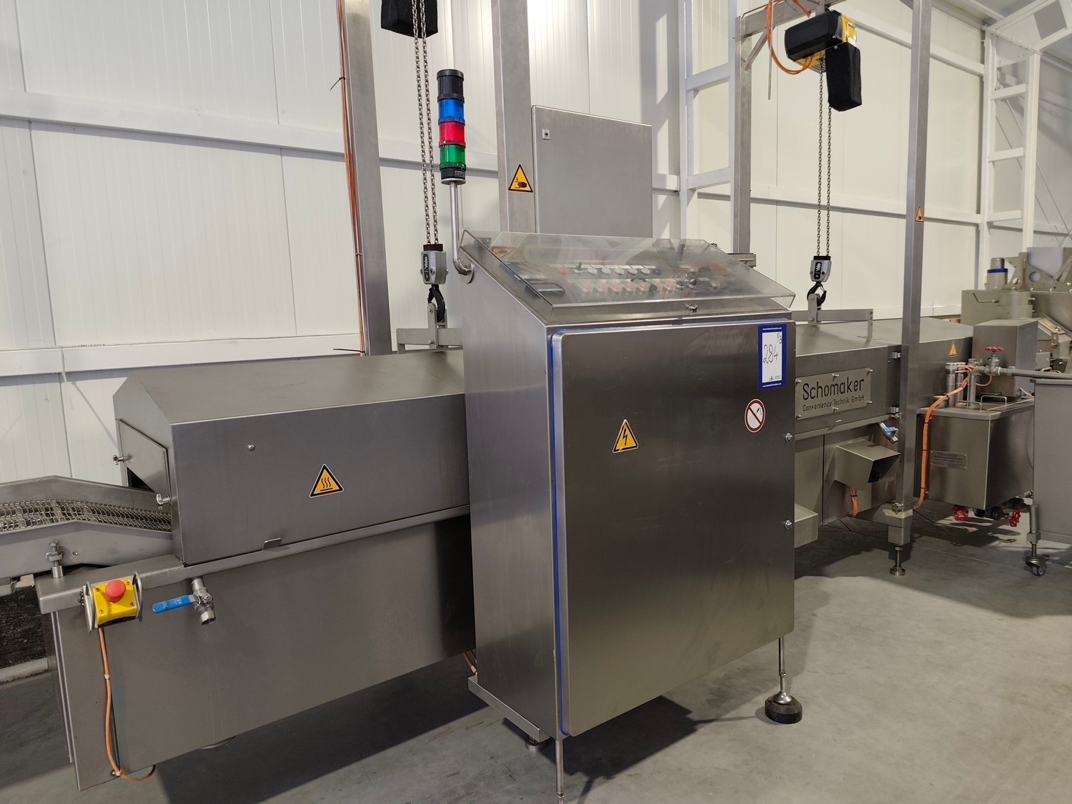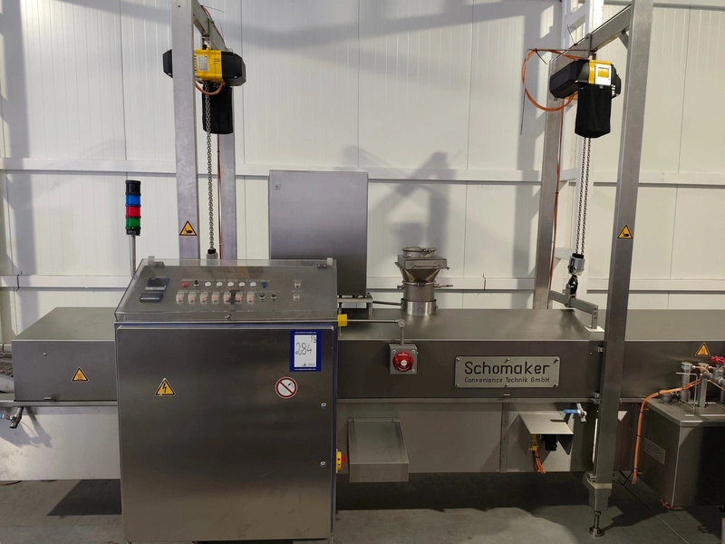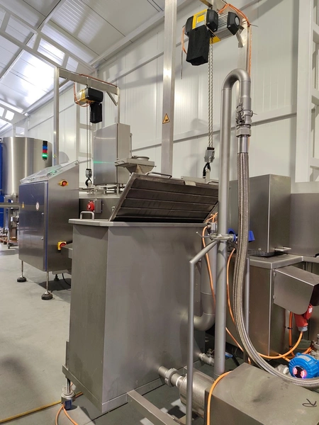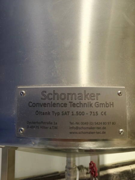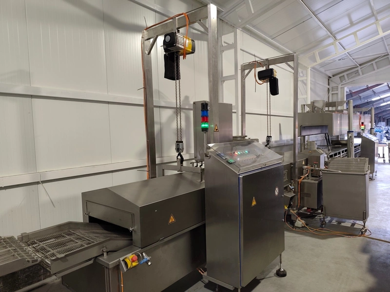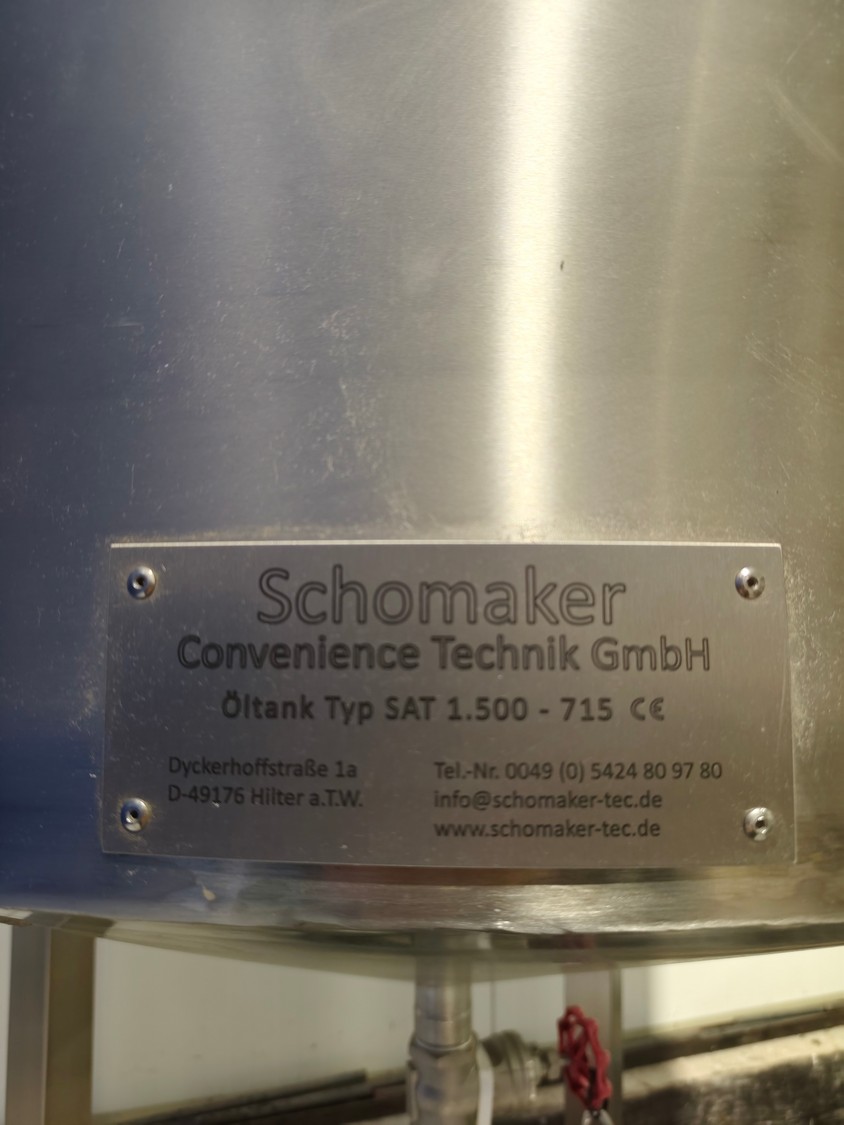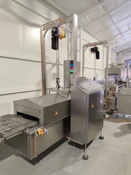 Schomaker Convenience Technik GmbH electric heated belt fryer with precise temperature control, type: Tec SFE 3.000/600 - 714, 88 kW, frying length: 3000 mm, s/s mesh belt, belt width: 600 mm, dimensions: overall length 6050 mm, width 1360 mm, total dimensions: 5900 mm x 3000 m x 1550 mm, Oil management system consisting of: Oil tank, type: SAT 1.500 - 715, tank dimensions: Ø 1400 mm x 2700 mm. Automatic oil level management, oil filtration and circulation system that minimizes oil consumption and costs.