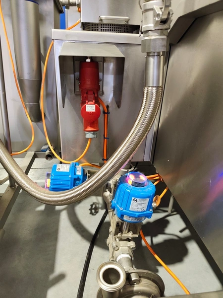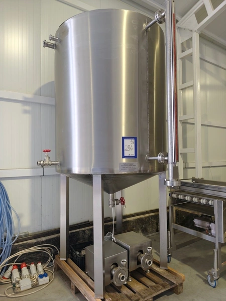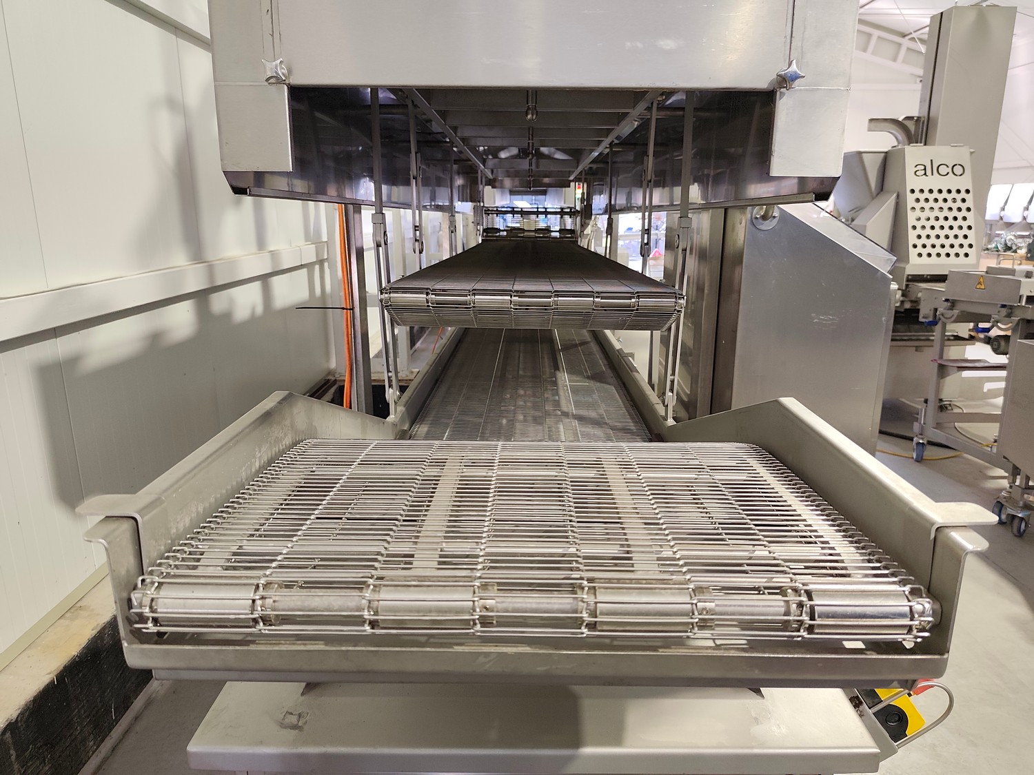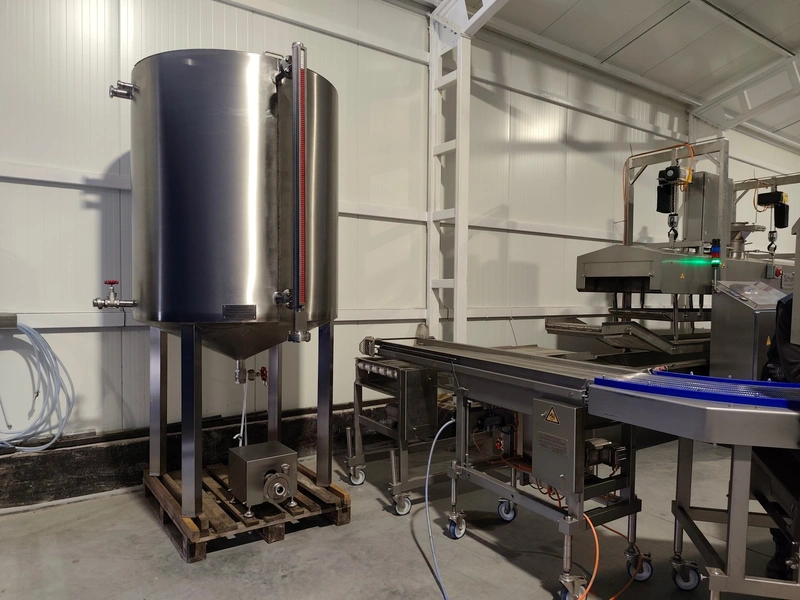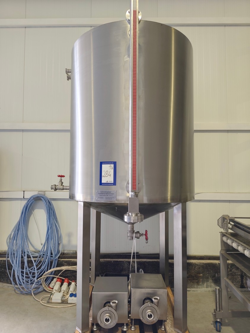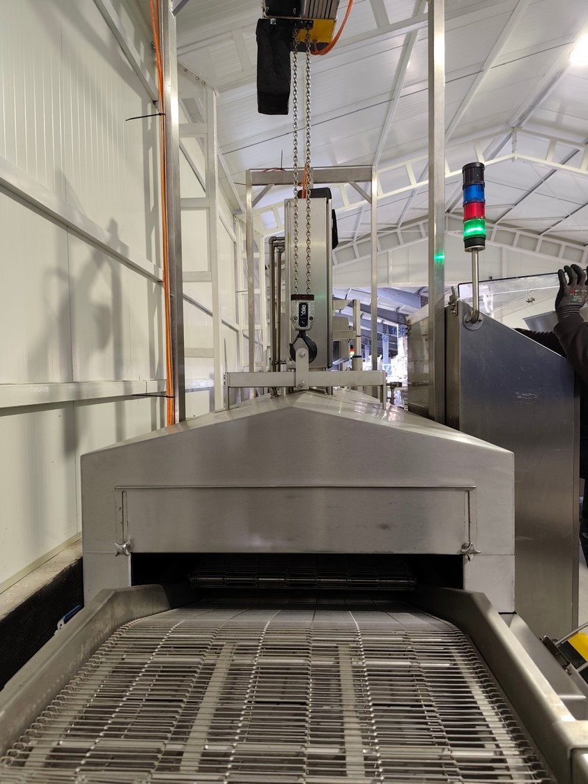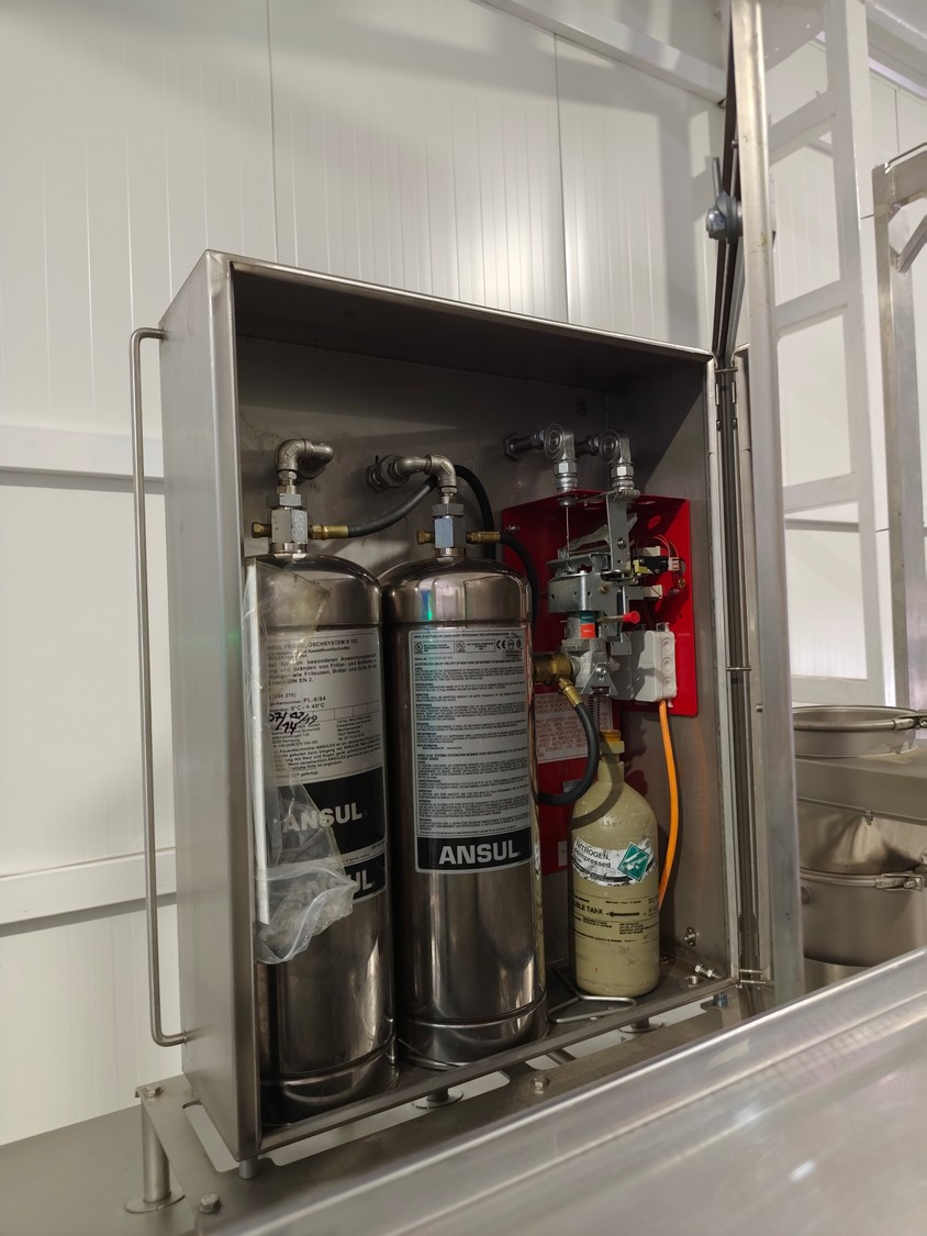 Schomaker Convenience Technik GmbH electric heated belt fryer with precise temperature control, type: Tec SFE 3.000/600 - 714, 88 kW, frying length: 3000 mm, s/s mesh belt, belt width: 600 mm, dimensions: overall length 6050 mm, width 1360 mm, total dimensions: 5900 mm x 3000 m x 1550 mm, Oil management system consisting of: Oil tank, type: SAT 1.500 - 715, tank dimensions: Ø 1400 mm x 2700 mm. Automatic oil level management, oil filtration and circulation system that minimizes oil consumption and costs.