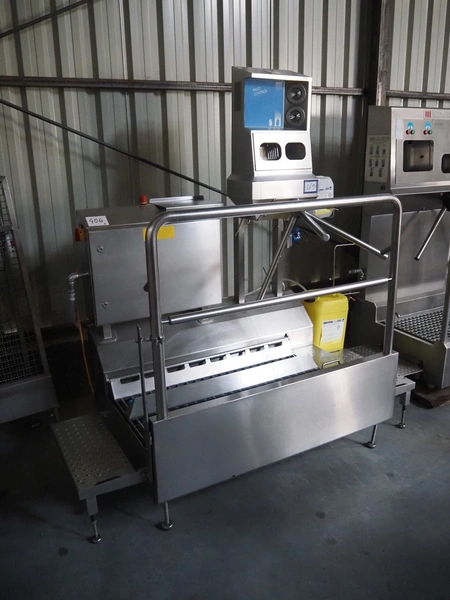 ITEC Food Technology hygiene station with sole cleaner, hand disinfection and tourniquet, type: 23872, serial number: 0025, order number: 49447, year of construction: 11/2003, 400 V, 3 Ph, 50 Hz, 0.3 kW, brush length: (2x) 900 mm, total dimensions: 1950 mm x 1000 mm x 2000 mm.