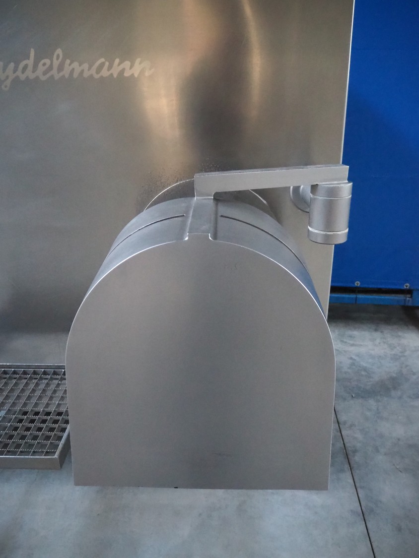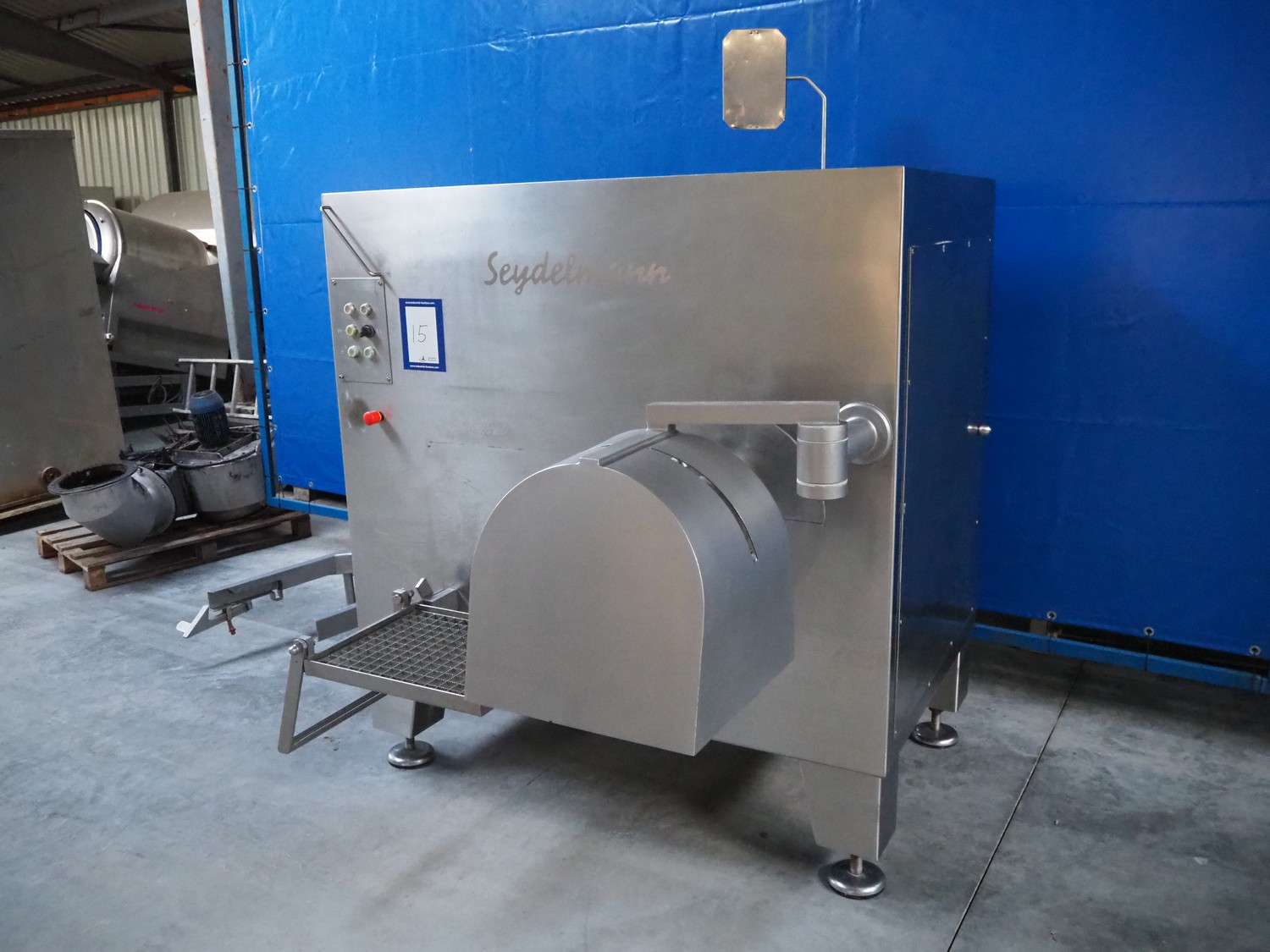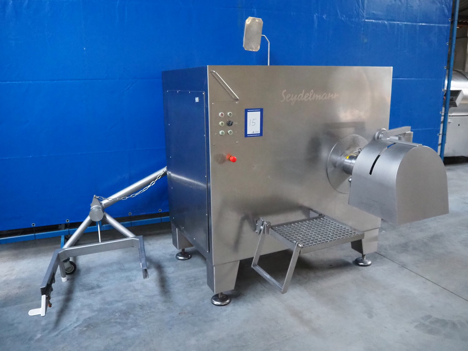 Seydelmann grinder with lifter for 200 liter meat bins, type: AG 160 B, machine number: 05642, year of construction: 2004, 400 V, 50 Hz, 74 A, 42 kW, 6-10 bar, diameter plate: 160 mm, total dimensions: 2850 mm x 2100 mm x 1750 mm.