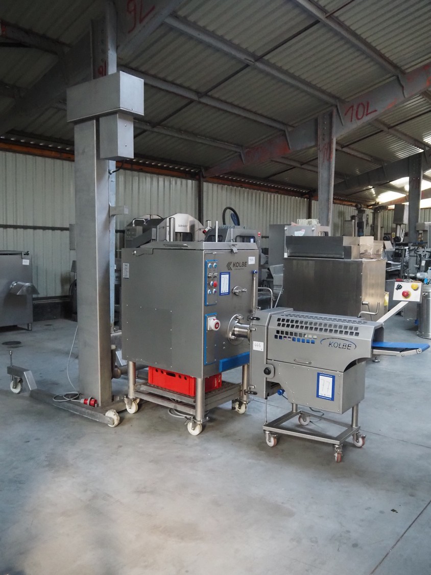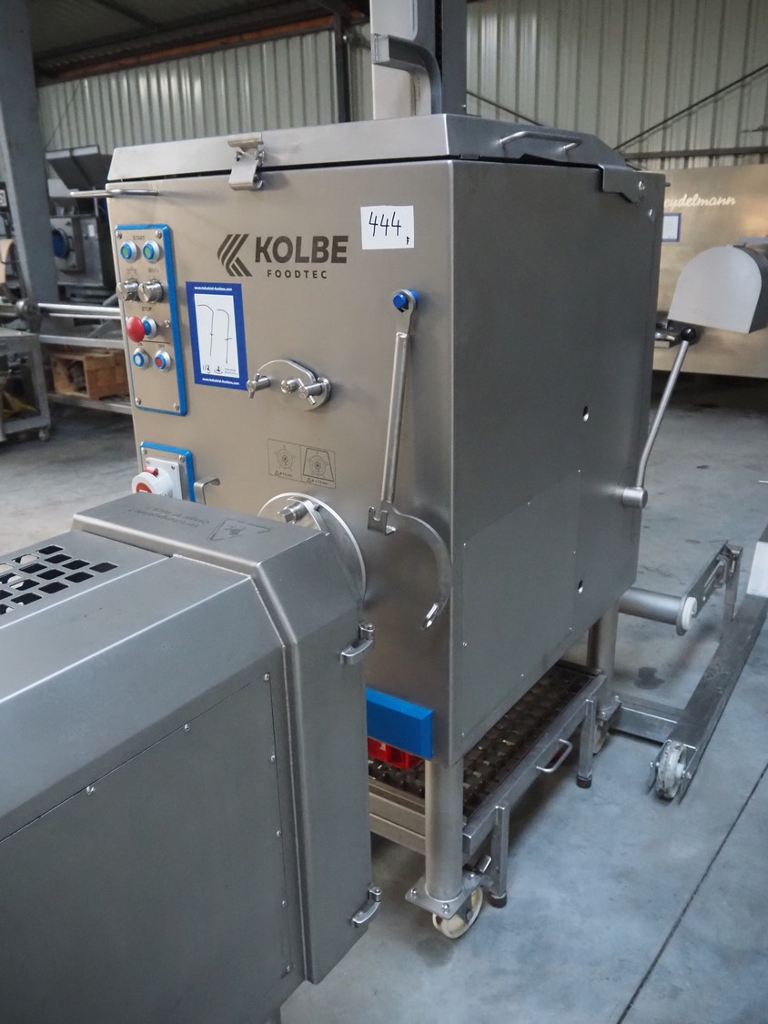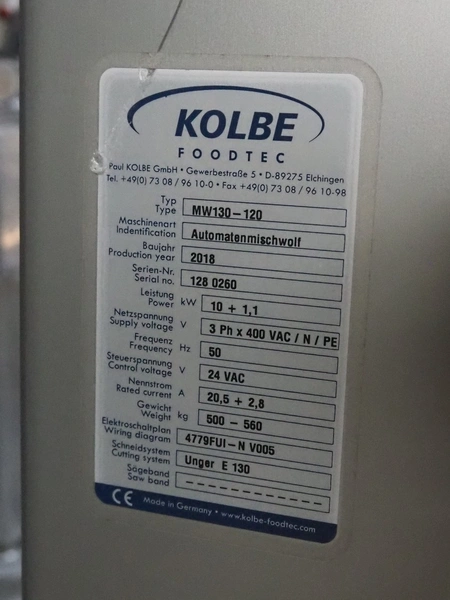 - Kolbe mobile mixer-grinder type: MW130-120, serial number: 128 0260, year of construction: 2018, 400 V, 3 Ph, 50 Hz, 20.5 + 2.8 A, 10 + 1.1 kW, weight: 500-560 kg, diameter plate: 175 mm, total dimensions: 1300 mm x 920 mm x 1640 mm;