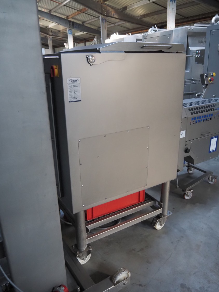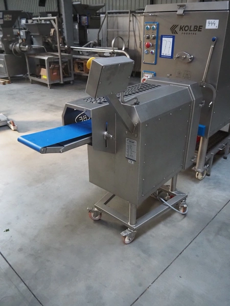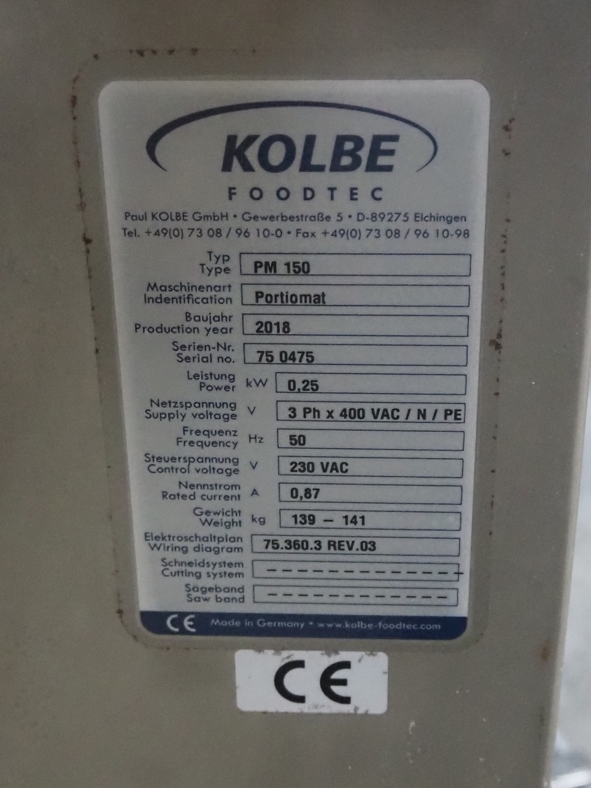 - Kolbe mobile portioner, type: PM 150, serial number: 75 0475, year of construction: 2018, 230/400 V, 3 Ph, 50 Hz, 0.87 A, 0.25 kW, weight: 139-141 kg, plastic belt, belt width: 200 mm, total dimensions: 1450 mm x 630 mm x 1350 mm;