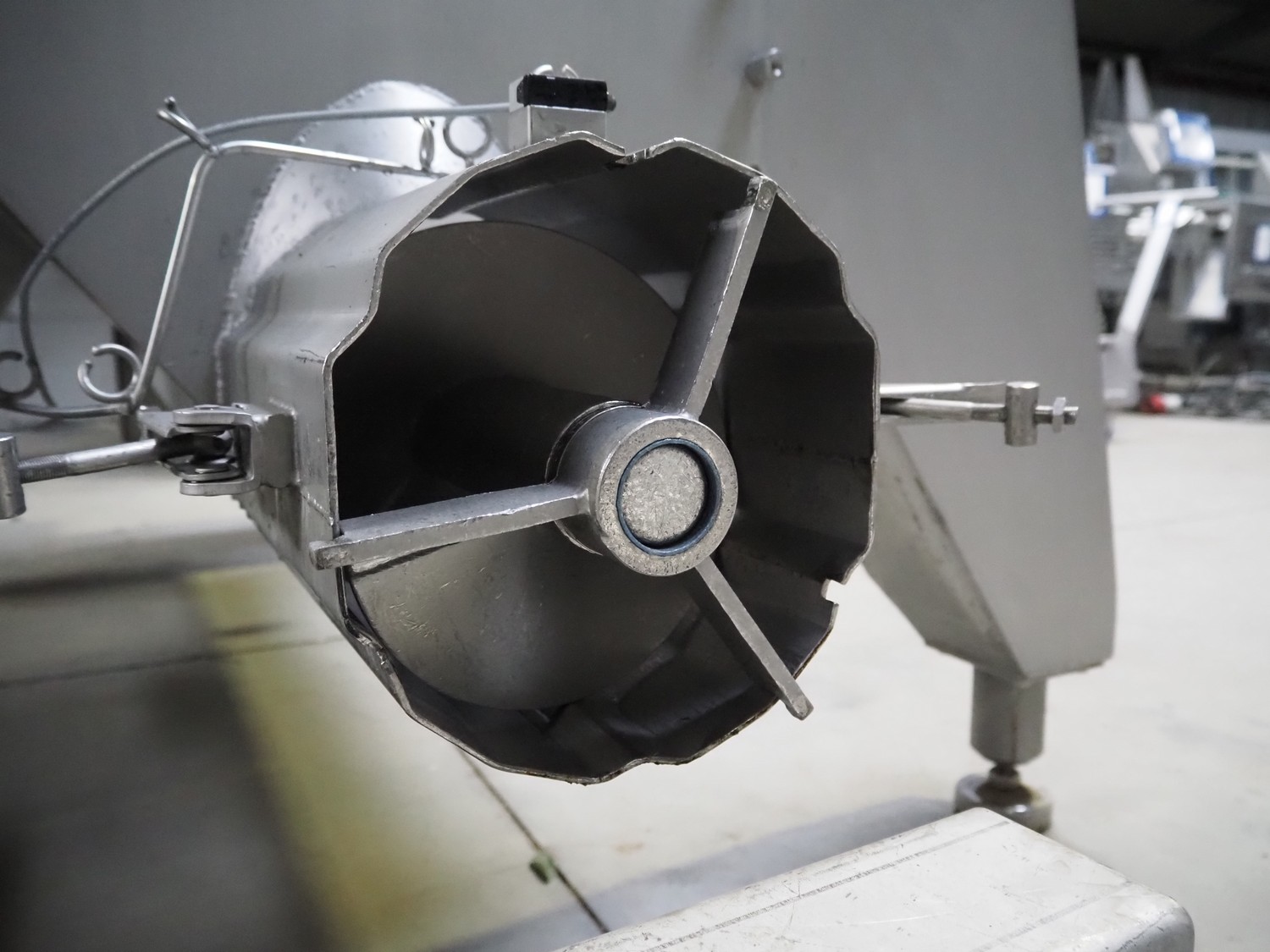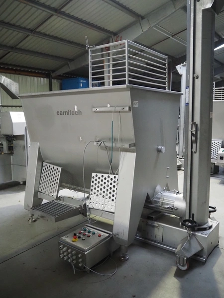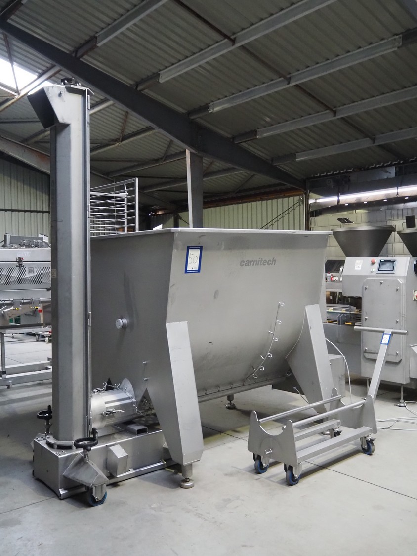 Carnitech s/s ribbon mixer, dimensions: 2300 mm x 1500 mm x 1200 mm, including Marel Carnitech mobile s/s giraf, model: B250, serial number: M10189, year of construction: 2016, 400 V 3 Ph, 50 Hz, 7.9 A, screw dimensions: 240 mm, tier: 180 mm, elevating height: 2500 mm, total dimensions: 2000 mm x 1000 mm x 3000 mm and s/s trolley, dimensions: 1350 mm x 450 mm x 970 mm.