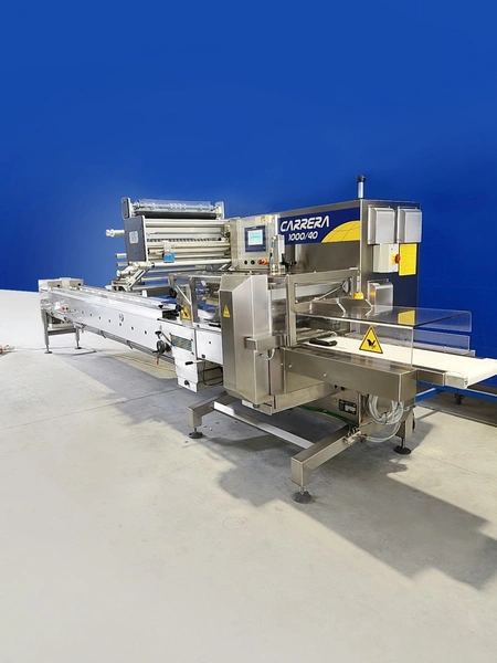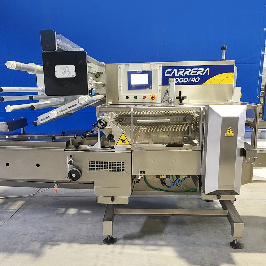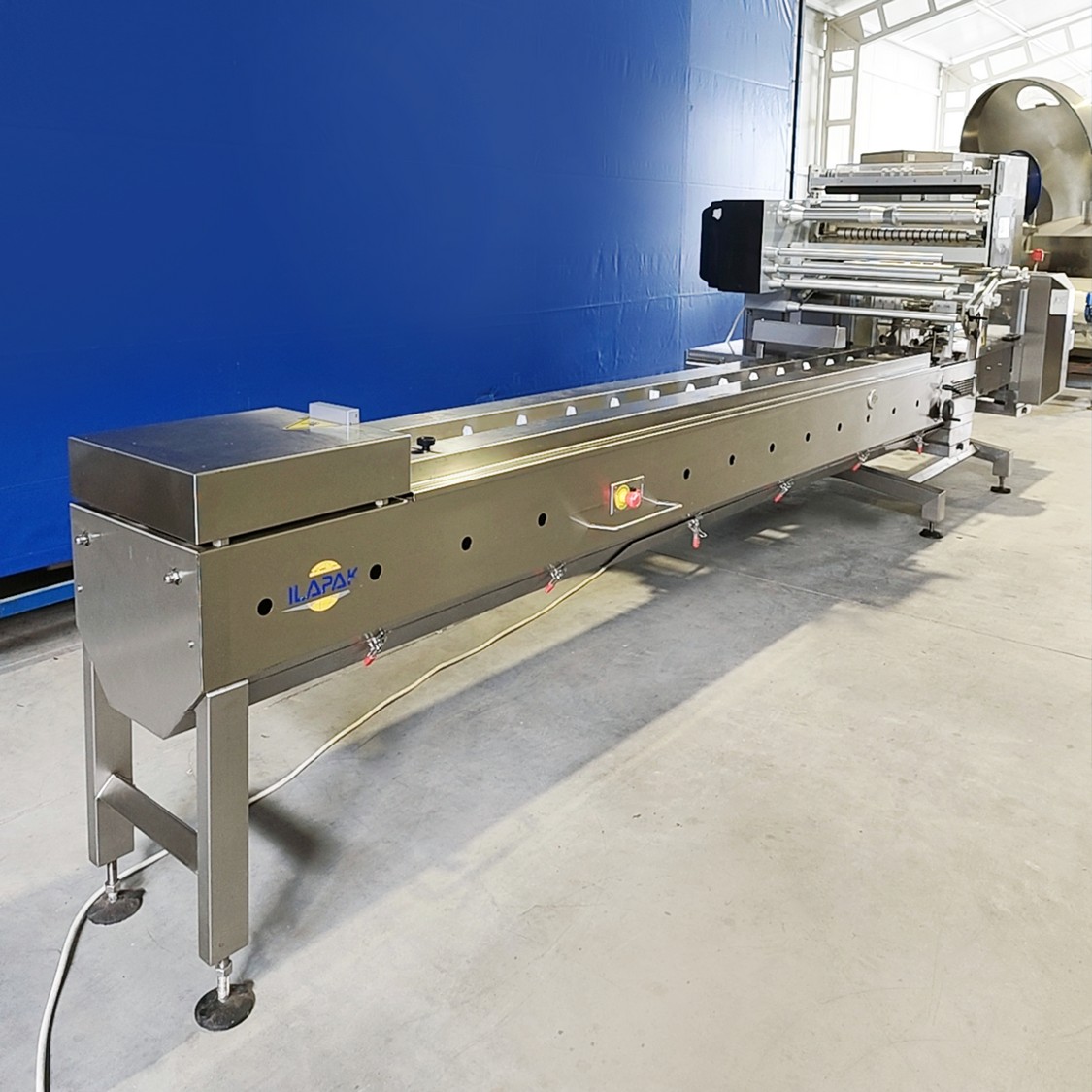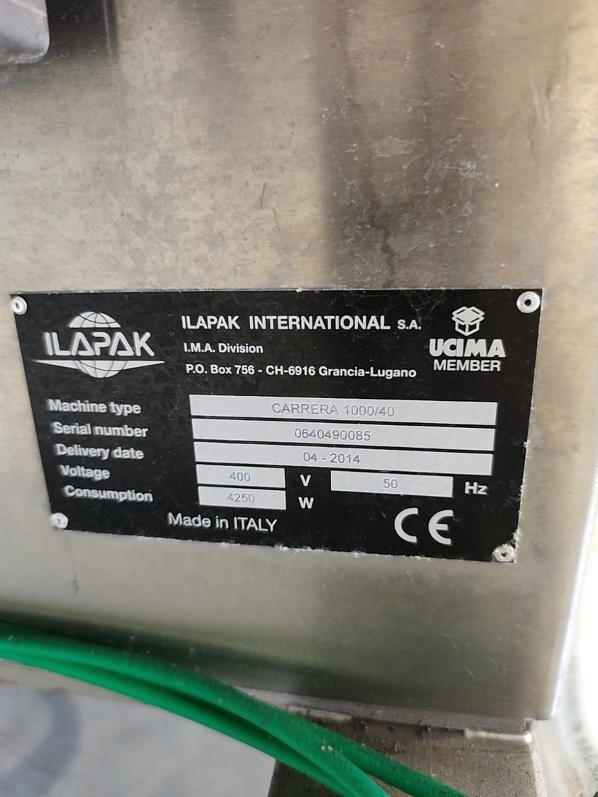 Ilapak flowpacker, type: Carrera 1000/40, serial number: 640490085, year of construction: 04-2014, 400 V, 3 Ph, 50 Hz, 7 A, plastic belt with dividers, distance between dividers: 200 mm, total dimensions: 5750 mm x 1350 mm x 1800 mm.
