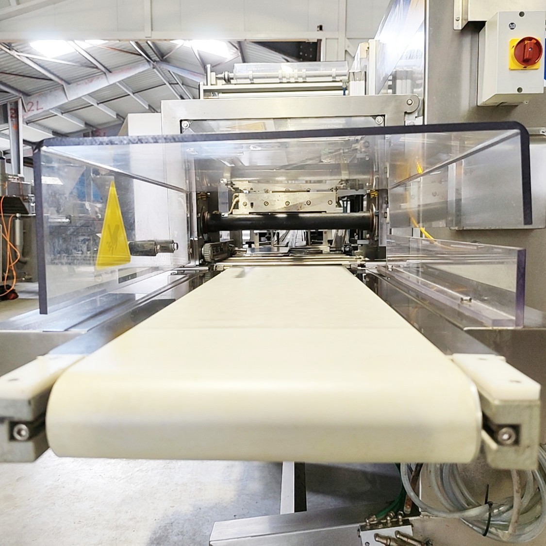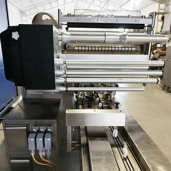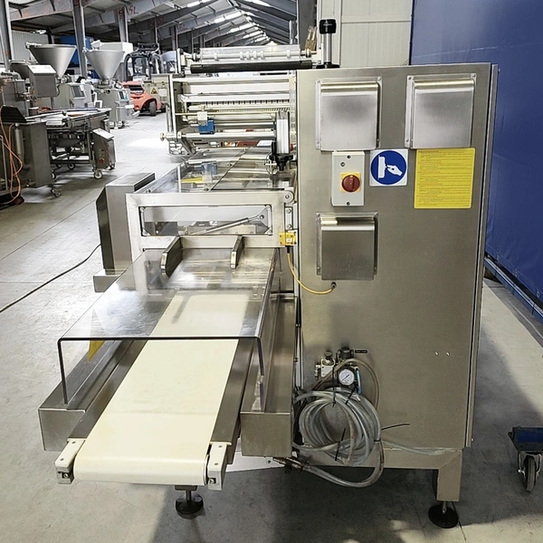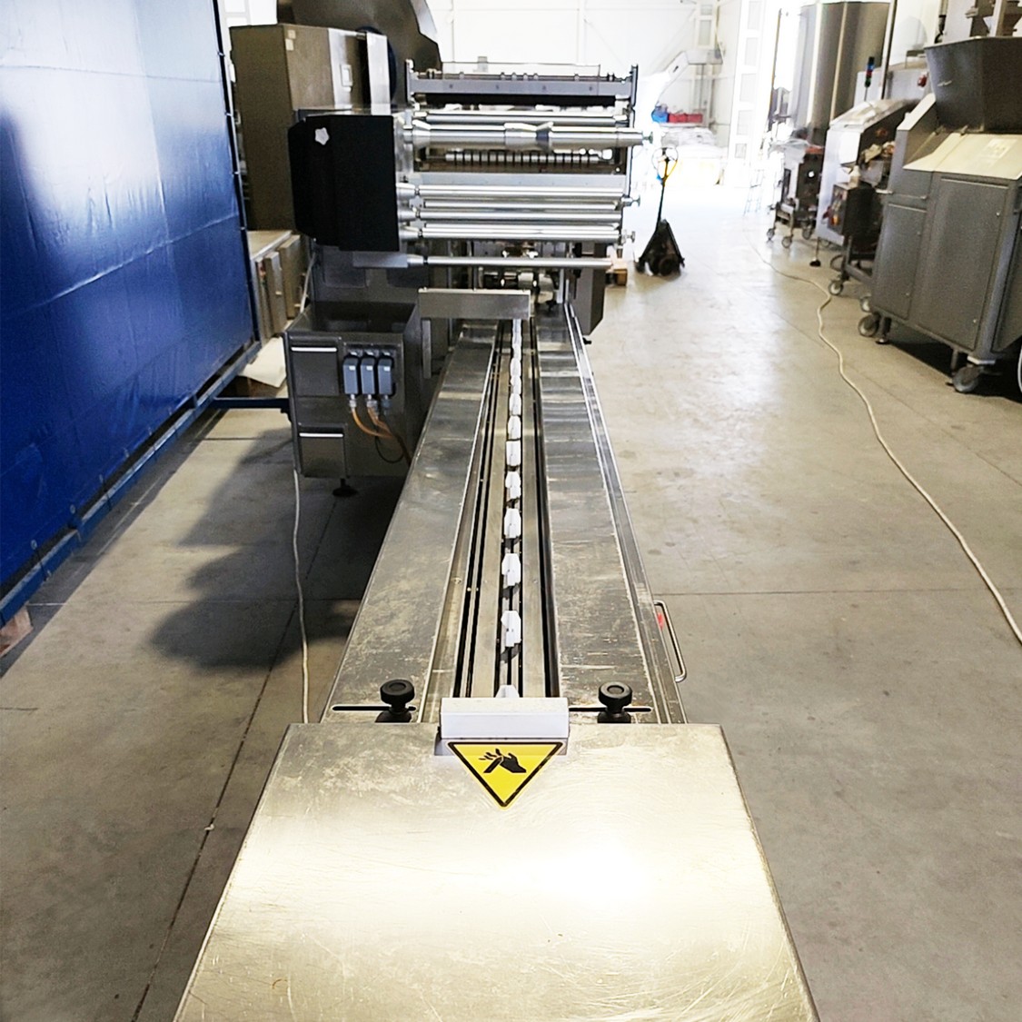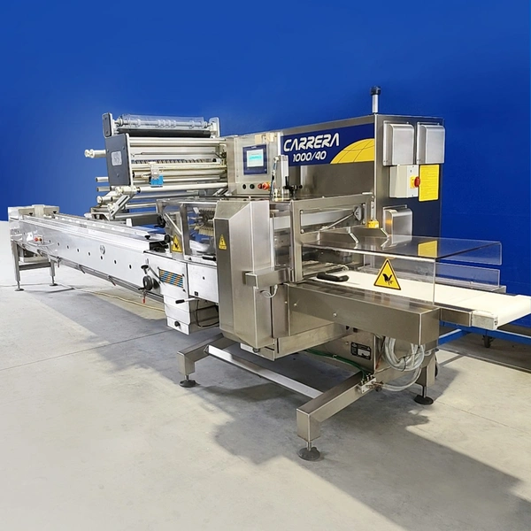Ilapak flowpacker, type: Carrera 1000/40, serial number: 640490085, year of construction: 04-2014, 400 V, 3 Ph, 50 Hz, 7 A, plastic belt with dividers, distance between dividers: 200 mm, total dimensions: 5750 mm x 1350 mm x 1800 mm.