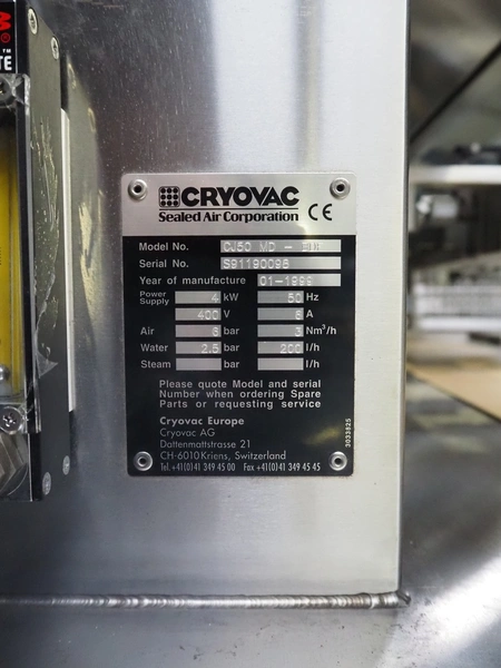 Cryovac flowpacker, model: CJ50 MD-BDF, serial number: S91190098, year of construction: 01/1999, 400 V, 50 Hz, 6 A, 4 kW, air pressure: 6 bar, water pressure: 2.5 bar, plastic belt, belt width: 220 mm, seal length: 260 mm, total dimensions: 5150 mm x 1000 mm x 1880 mm.