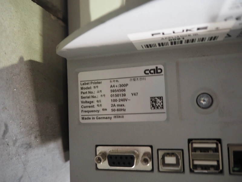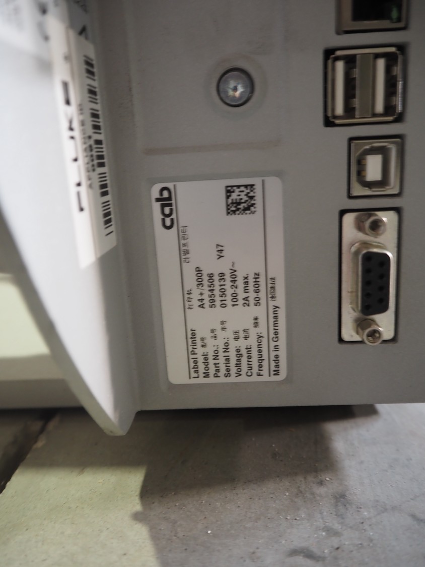 CAB label printer, model: A4+/300P, serial number: 0150139 Y47, 100/240 V, 1 Ph, 50/60 Hz, dimensions: 450 mm x 240 mm x 275 mm.