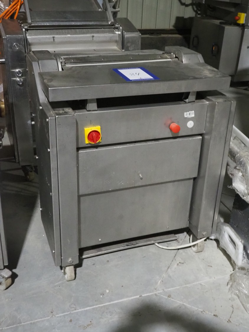 Townsend mobile skinning machine, model: 7500, serial number: 1179, year of construction: 1992, 380 V, 3 Ph, 50 Hz, 2.0 A, working width: 500 mm, foot control, total dimensions: 900 mm x 550 mm x 1100 mm.