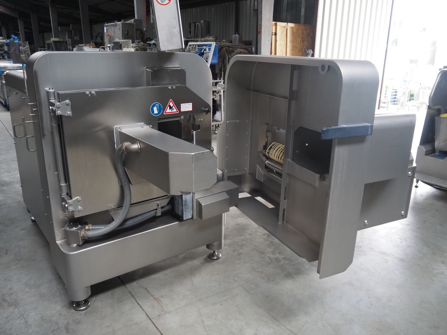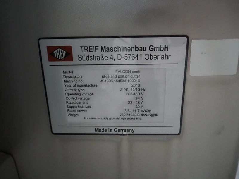 Treif Maschinenbau GmbH slicer and portion cutter, type: FALCON conti, machine number: 461005.154538.109916, year of construction: 2010, 24/380/480 V, 3 Ph, 50/60 Hz, 18/22/32 A, 8.6/11.7 kW, clearance: 260 mm x 220 mm, dimensions: 4300 mm x 1400 mm x 1900 mm. Without belt. Including s/s tool trolley with knife holders, dimensions trolley: 1400 mm x 750 mm x 1600 mm.