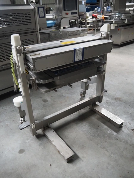 Sealpac GmbH traysealer, type: SEALPAC 800+, serial number: TVG 01 1123 01, year of construction: 2004, 230/400 V, 3 Ph, 10 kW, 2000 kg, chain belt, belt width: 40 mm, clearance: 340 mm x 110 mm, total dimensions: 3750 mm x 950 mm x 2150 mm. Including outfeed belt, dimensions: 3800 mm x 700 mm x 1200 mm and s/s trolley with dye, dimensions dye: 250 mm x 70 mm, total dimensions: 1500 mm x 1150 mm x 1350 mm.