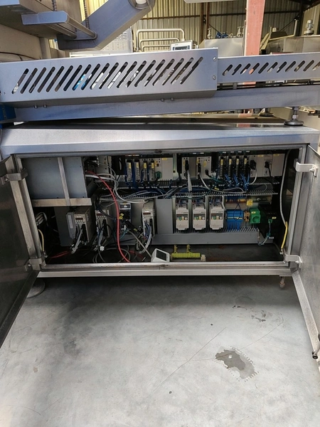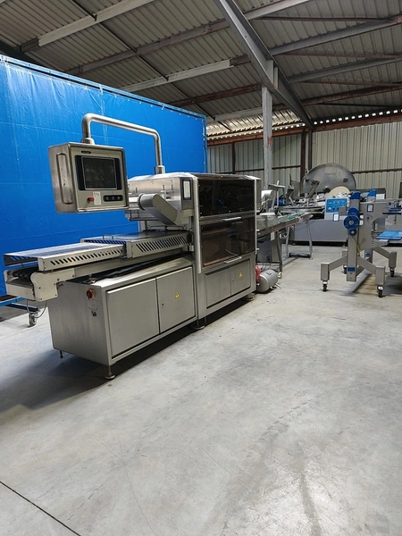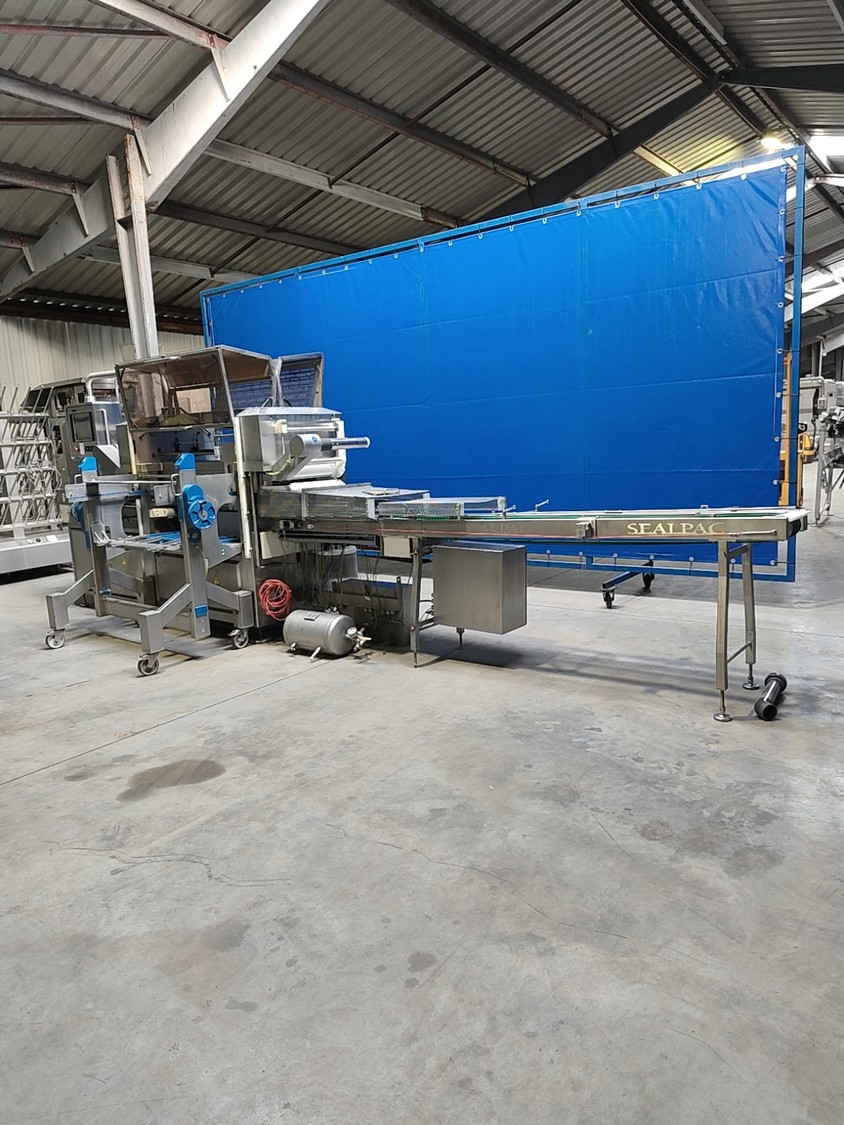 Sealpac traysealer, model: 800+, serial number: TVG 01 1120 01, year of construction: 2004, 400 / 230 V, 3 Ph, 50 Hz, 10 kW, weight: 2000 kg, dye dimensions: (5x) 200 mm x 155 mm, total dimensions: 6600 mm x 900 mm x 2200 mm. Including dye trolley, dimensions 1600 mm x 1000 mm x 1400 mm.