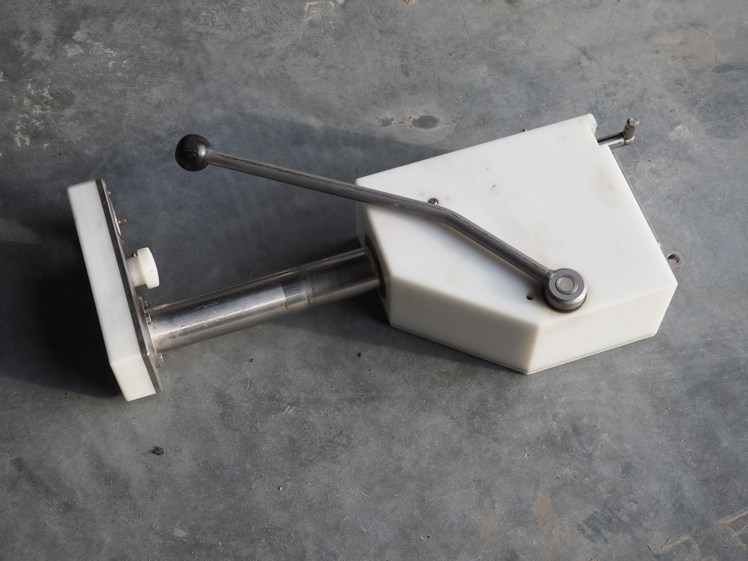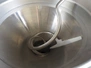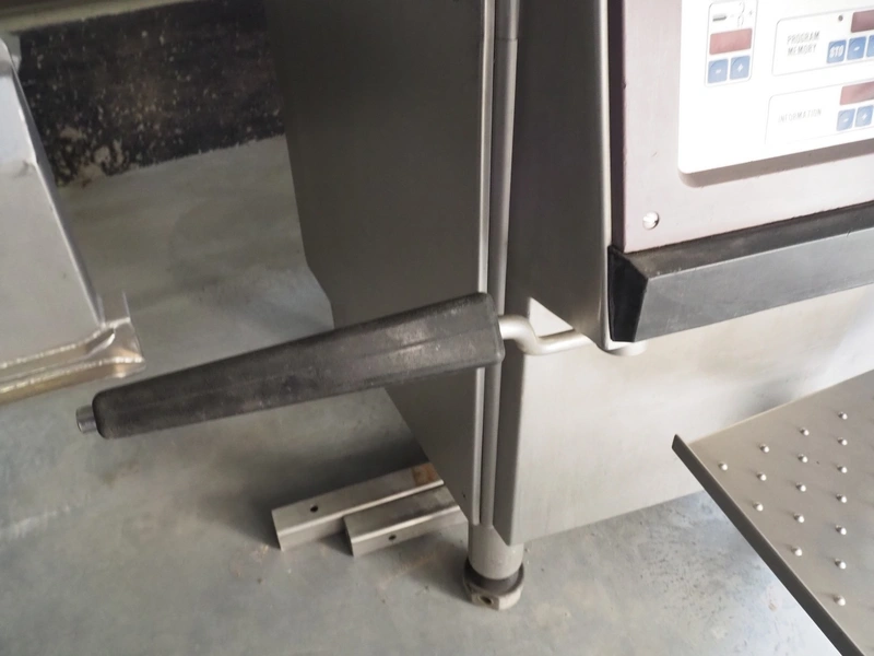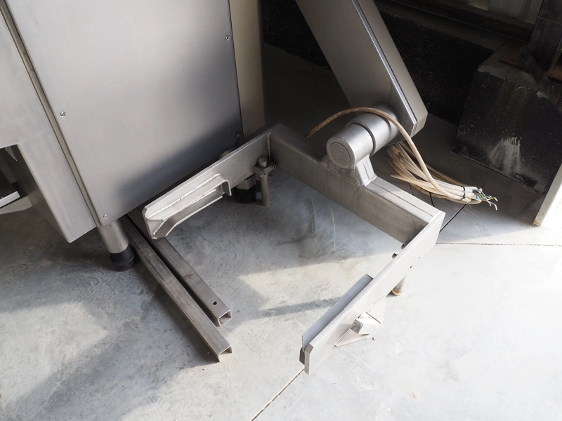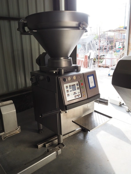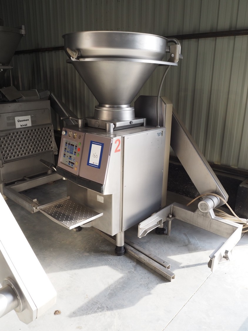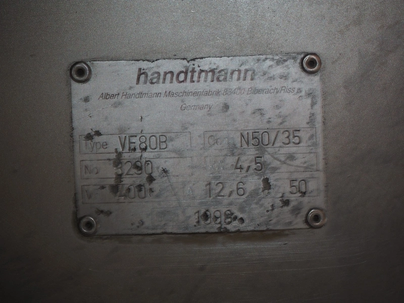 Handtmann vacuum filling machine with lifter for 200 liter meat bins, type: VF80B, number: 3290, year of construction: 1998, 400 V, 50 Hz, 12.6 A, 4.5 kW, filling, portioning and linking, dimensions: 1800 mm x 1200 mm x 1850 mm. Including Handtmann case holding device, type: 216-01, number: 1757.