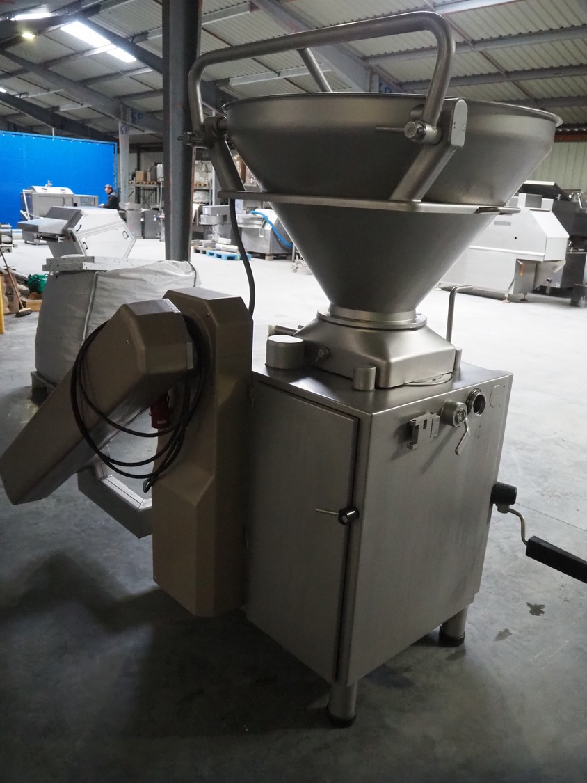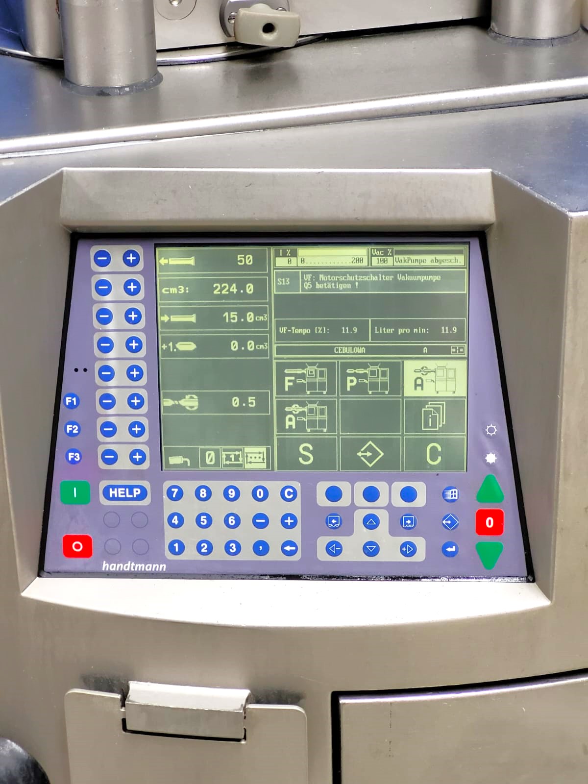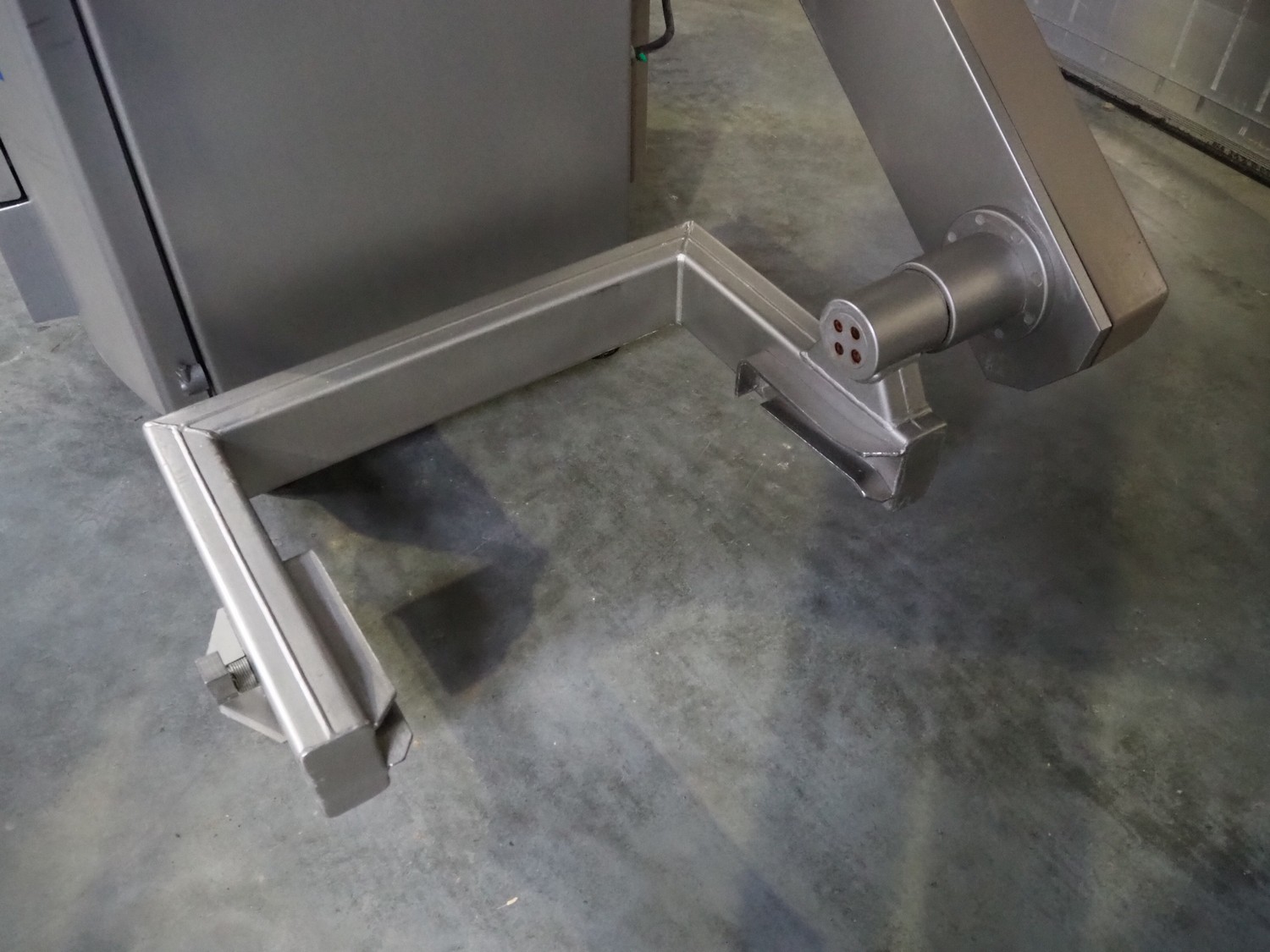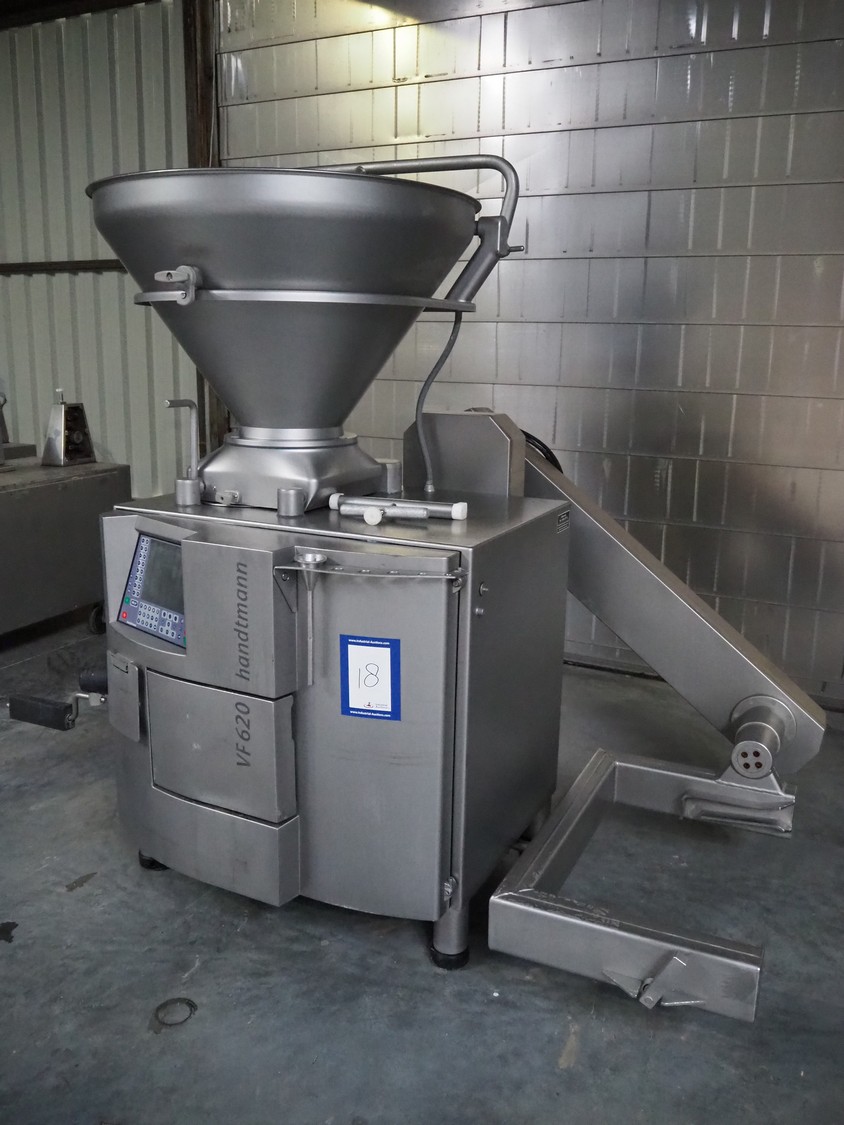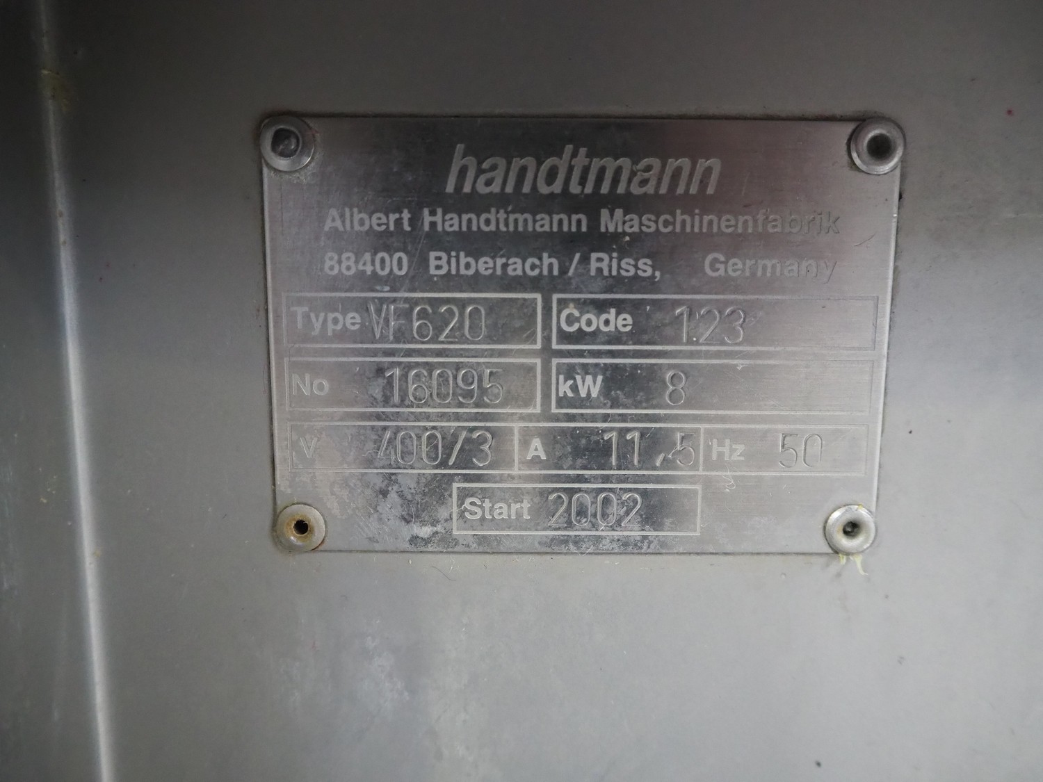 Handtmann vacuum filling machine with lifter for 200 liter meat bins, type: VF620, number: 16095, year of construction: 2002, 400 V, 3 Ph, 50 Hz, 11.5 A, 8 kW, knee control, dimensions: 2200 mm x 1400 mm x 1900 mm.