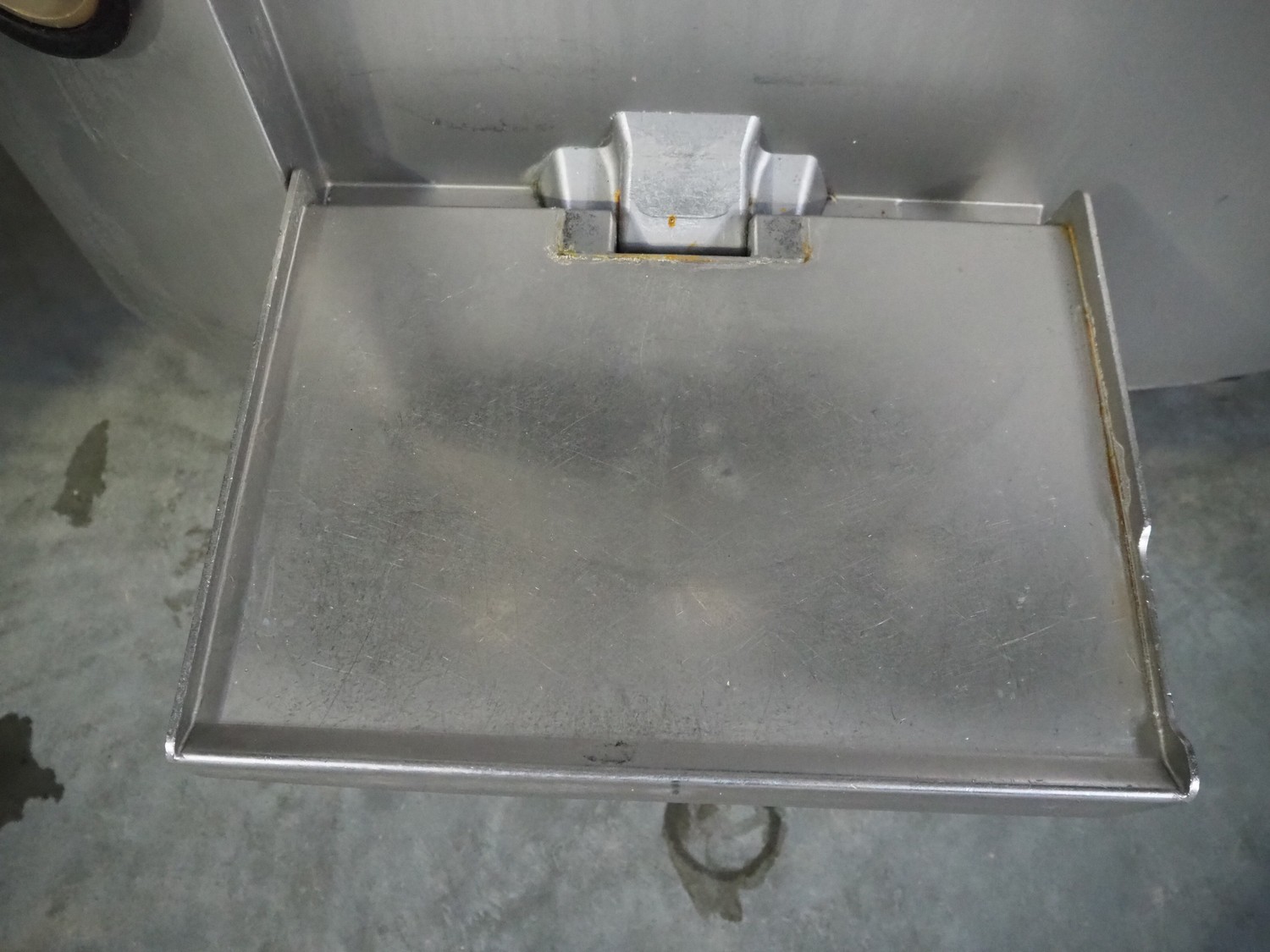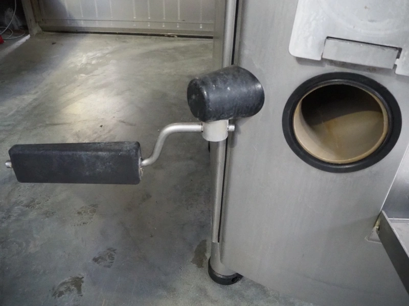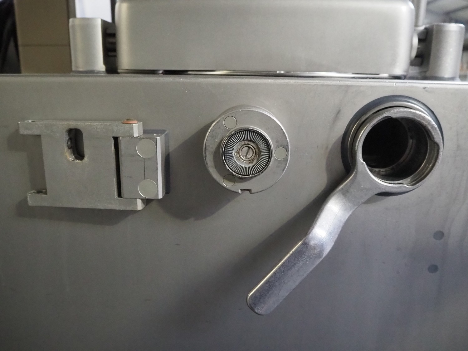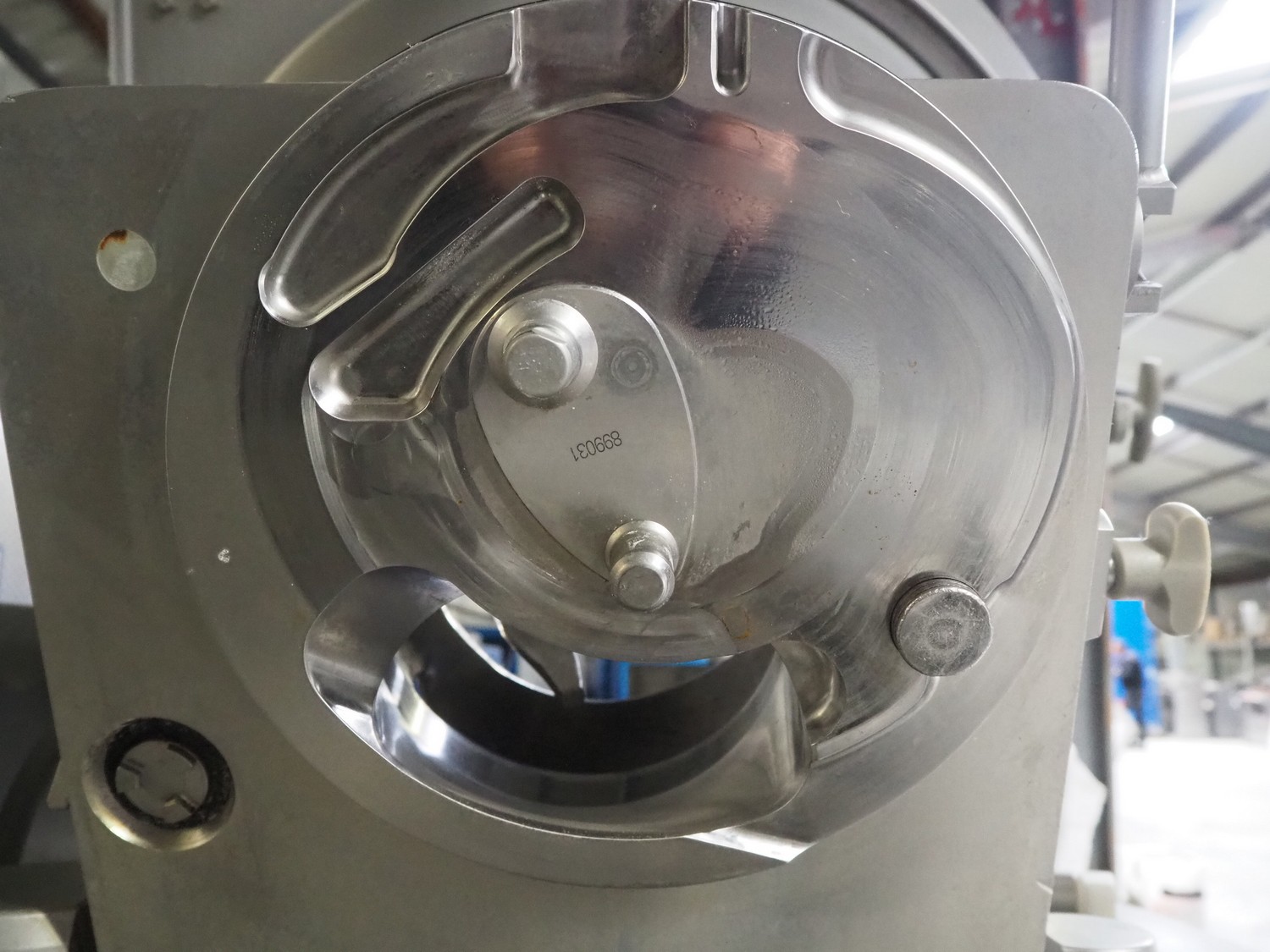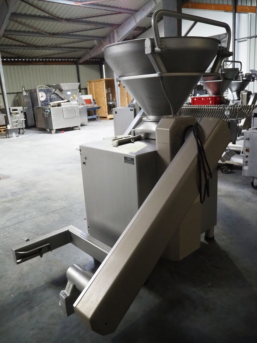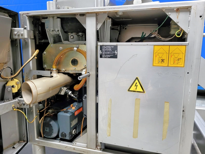 Handtmann vacuum filling machine with lifter for 200 liter meat bins, type: VF620, number: 16095, year of construction: 2002, 400 V, 3 Ph, 50 Hz, 11.5 A, 8 kW, knee control, dimensions: 2200 mm x 1400 mm x 1900 mm.