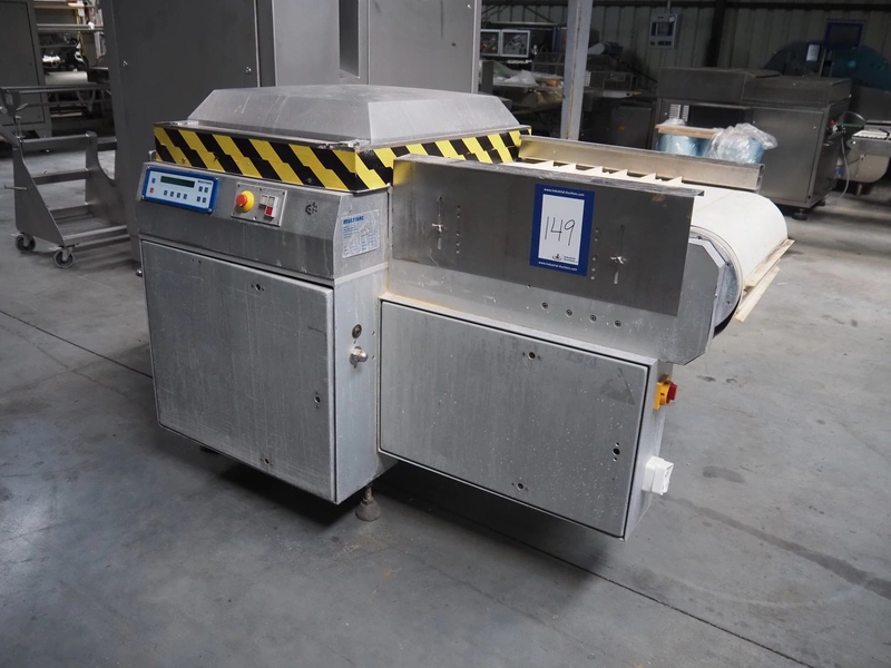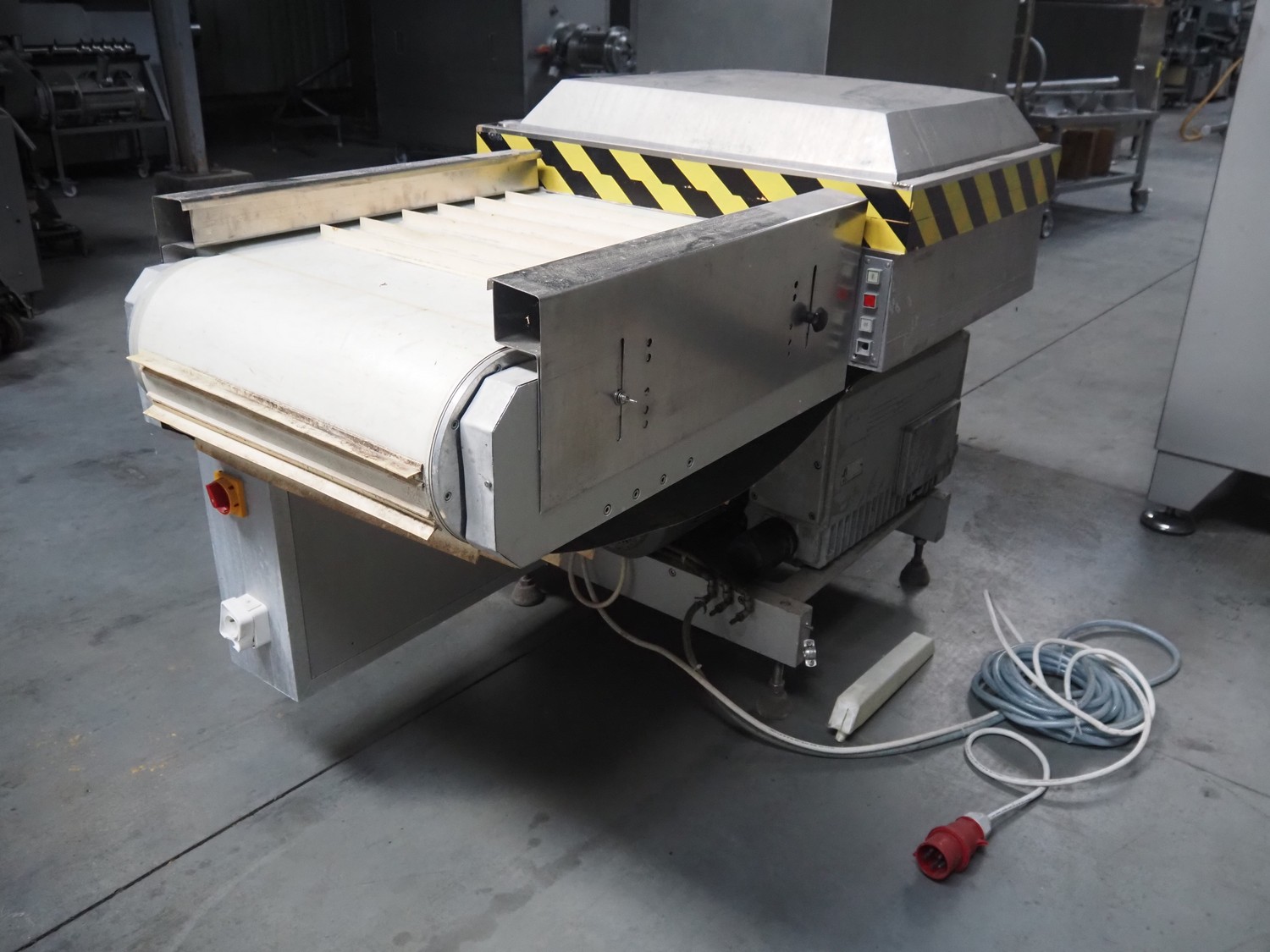 Multivac belt vacuum machine, type: B890, machine number 270, year of construction: 1996, 400 V, 3 Ph, 50 Hz, 25 A, 7 kW, plastic belt with dividers, plastic belt width: 600 mm, distance between dividers: 75 mm, divider height: 30 mm, Busch vacuum pump, type: RA 0250 C 4ZI QMZZ, capacity: 250 m3/h, total dimensions: 1700 mm x 1100 mm x 1250 mm.