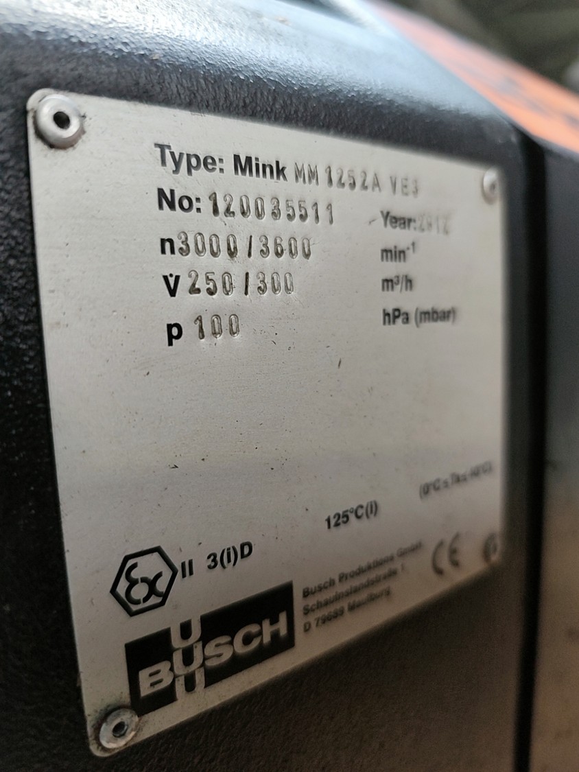 Busch vacuum Pump, type: Mink MM 1252A VE3, serial number: 110035511, year of construction: 2012, 3000/3600 min-1, capacity: 250/300 m3/h, 100hPa (mbar), dimensions: 1200 mm x 520 mm x 850 mm.